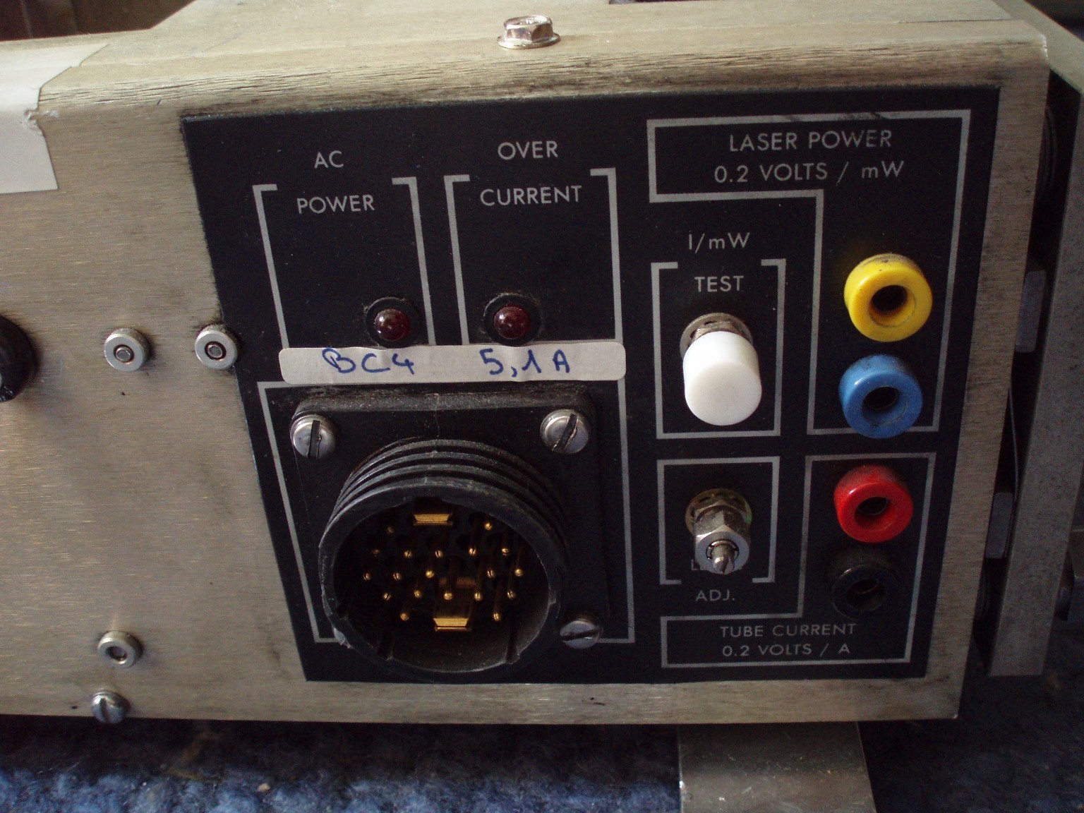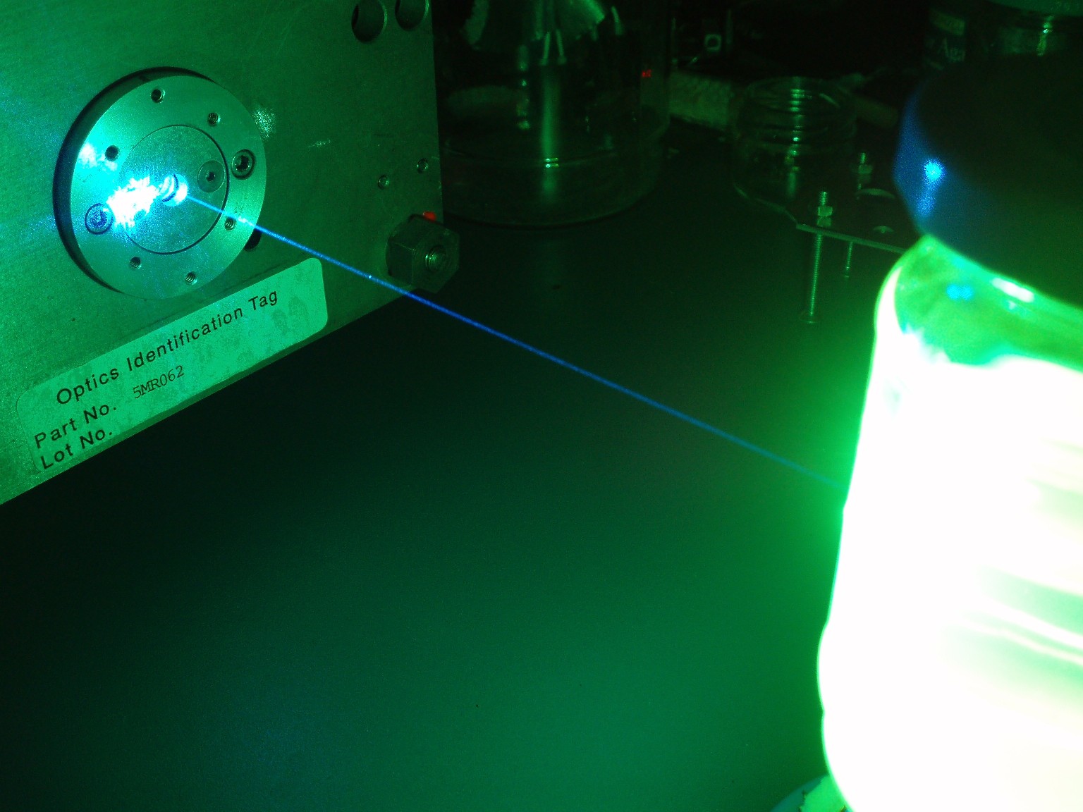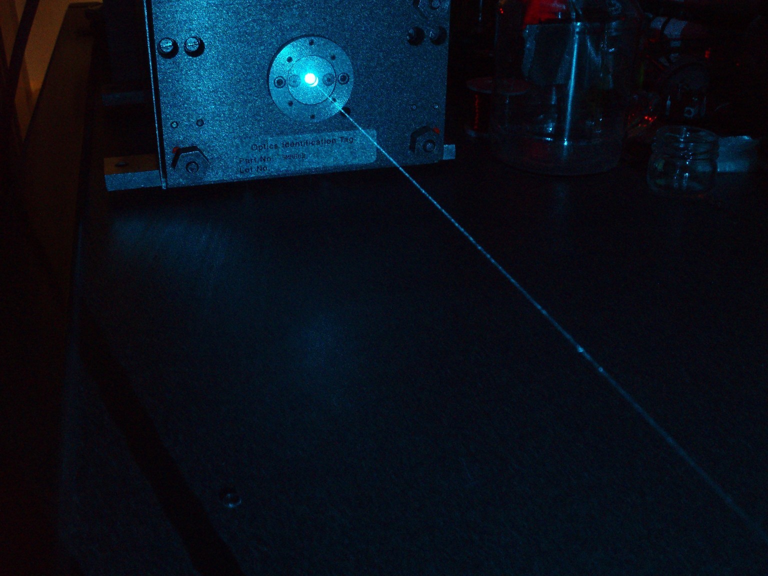 Dieser ALC60X ist in einem sehr guten Zustand. Nach allem was ich weiß, bringt der Kopf bei 10 A Röhrenstrom immerhin noch etwa 200 mW (mittlerweile vermutlich mehr). Im Moment hat der Laser noch weniger als 250 Stunden auf dem Buckel. Eigenartigerweise scheinen nur 8 der üblichen 9 Linien anzuschwingen, obwohl die Leistung locker ausreicht, um Rauchzeichen auf der 2,5 m vom Laser entfernten Holztür zu erzeugen. |