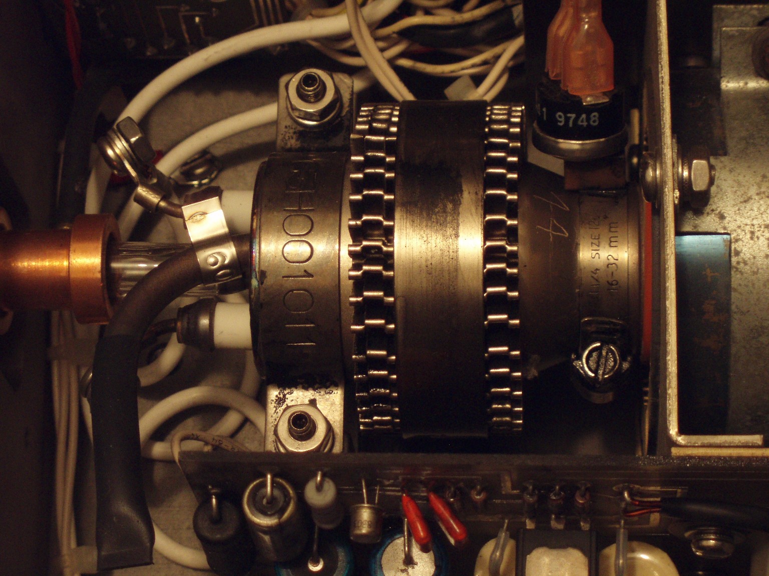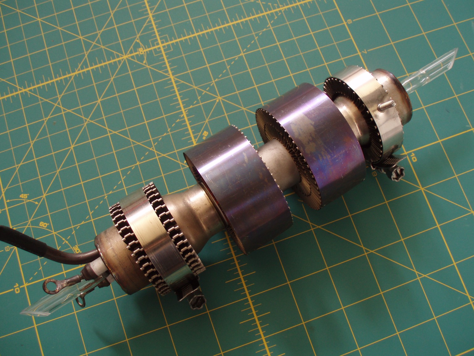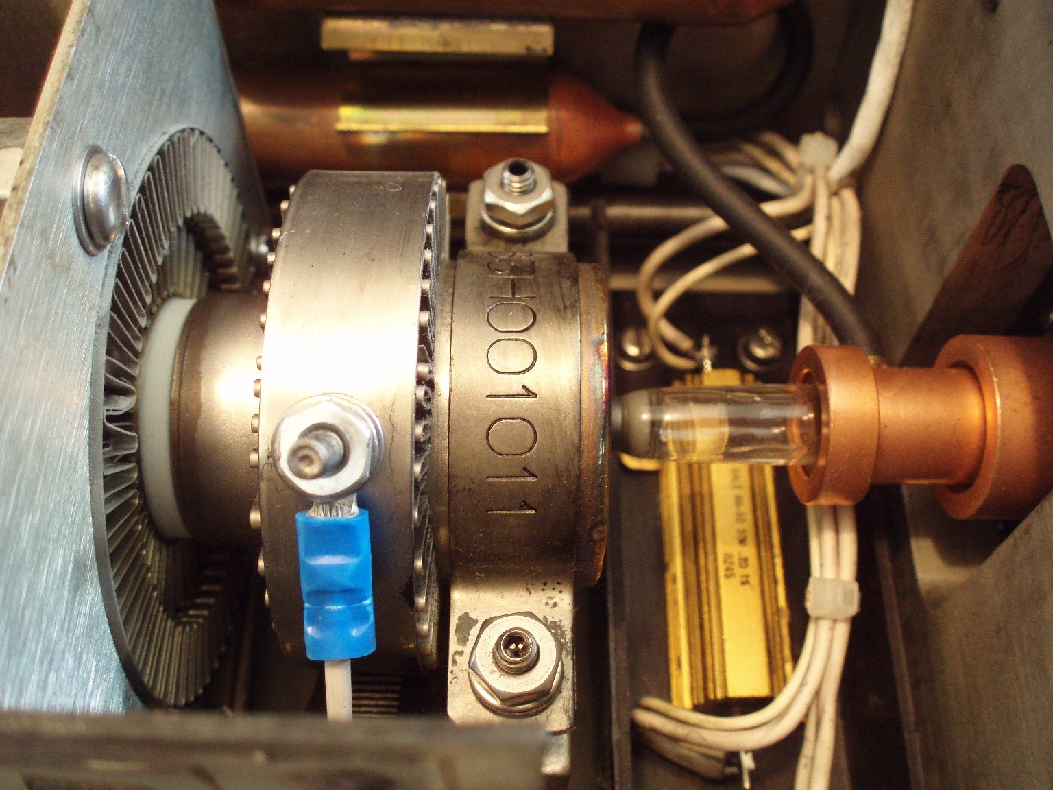 Dieser ALC60X ist in einem sehr guten Zustand. Nach allem was ich weiß, bringt der Kopf bei 10 A Röhrenstrom immerhin noch etwa 200 mW (mittlerweile vermutlich mehr). Im Moment hat der Laser noch weniger als 250 Stunden auf dem Buckel. Eigenartigerweise scheinen nur 8 der üblichen 9 Linien anzuschwingen, obwohl die Leistung locker ausreicht, um Rauchzeichen auf der 2,5 m vom Laser entfernten Holztür zu erzeugen. |