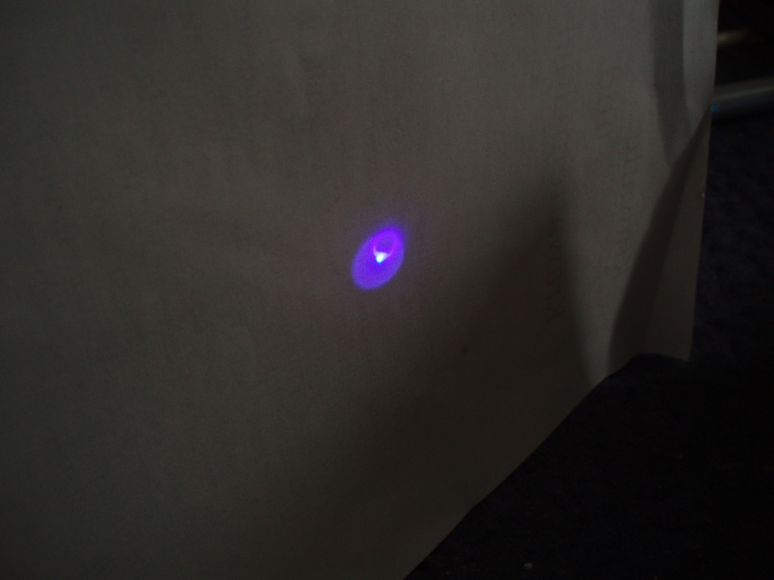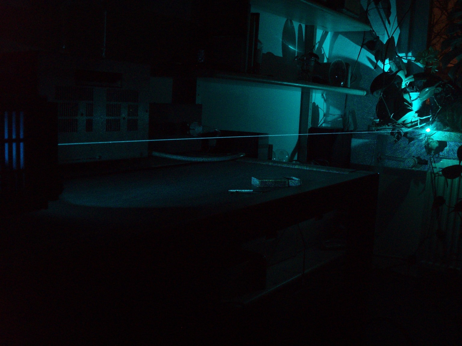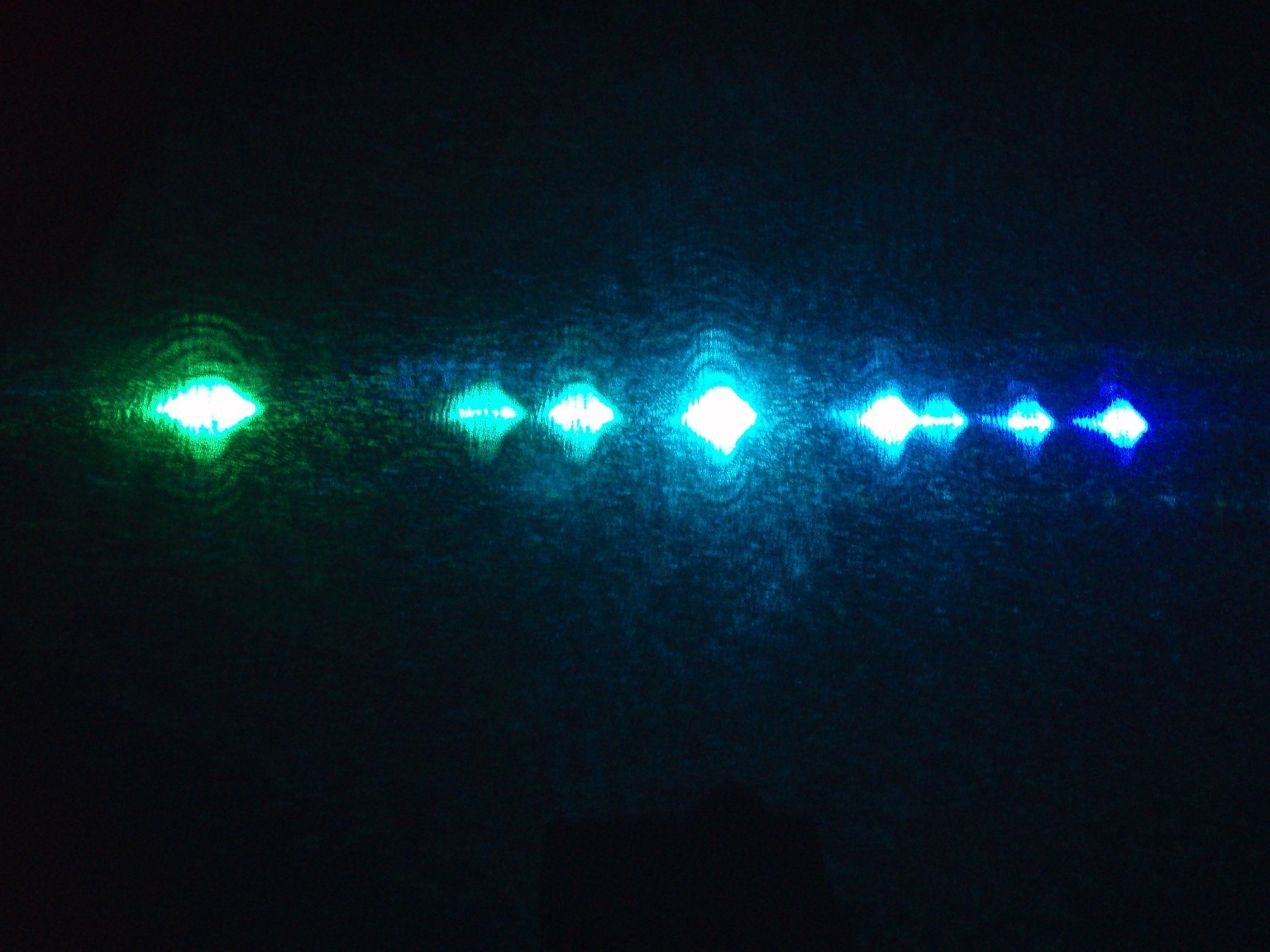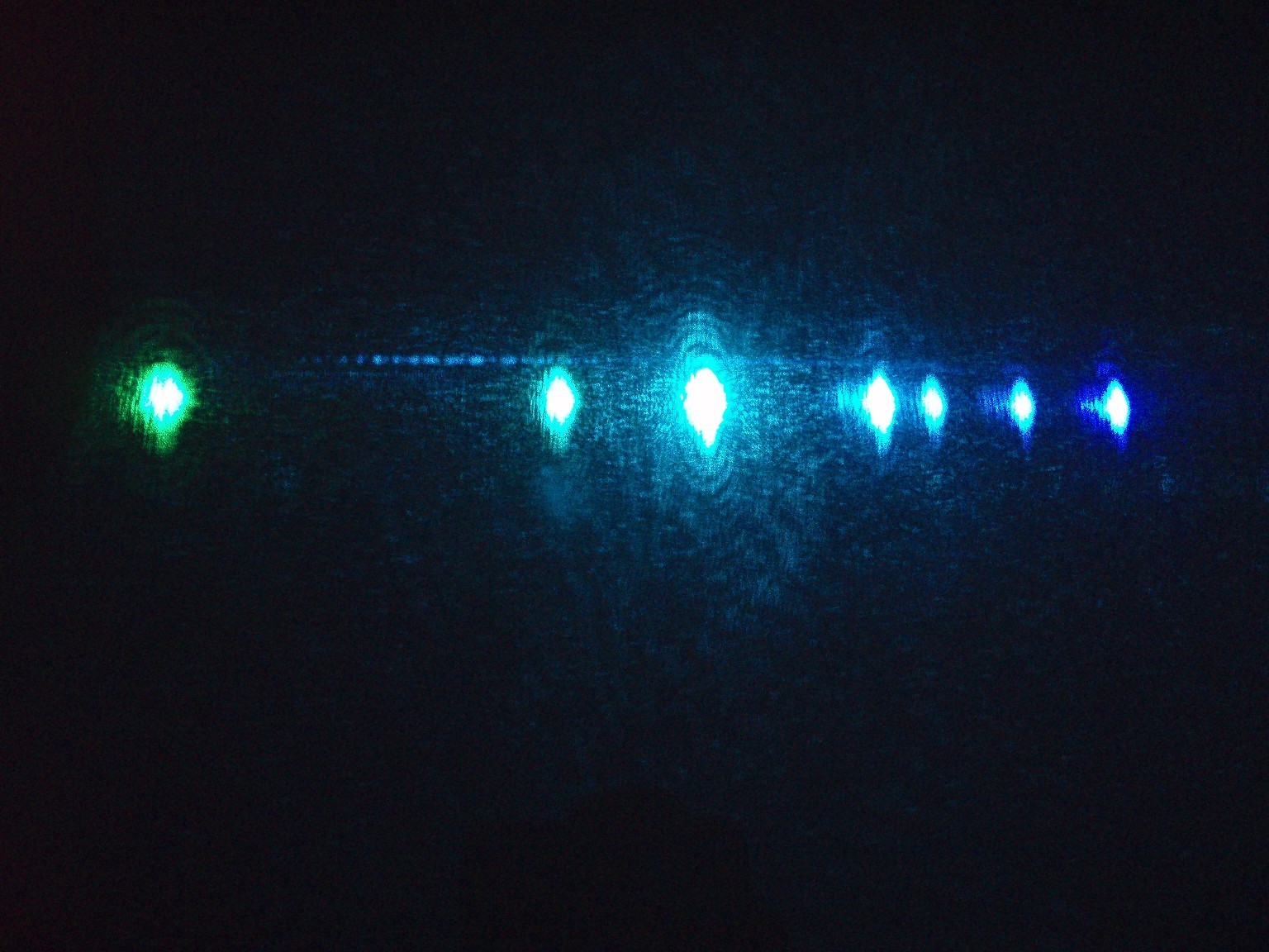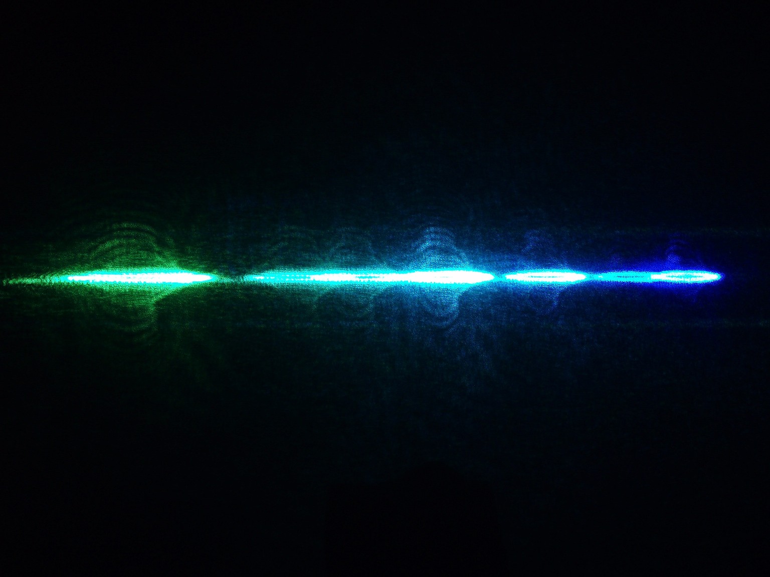 Diese drei Bilder zeigen die Linien, auf denen der Laser schwingt. Auf dem ersten Foto sind nur sieben Linien zu sehen und erst wenn die Leistung höher gedreht wird (Bild 2), erscheint eine zusätzliche türkise Linie. Beim dritten Foto wurde die Leistung noch höher gedreht. Offensichtlich hats hierbei die CD angekokelt. Die Bilder geben obendrein noch am ehesten die Schönheit der Laserfarben wieder. Die grüne Linie ist bei diesem Laserkopf ausergewöhnlich stark. Selbst bei niedriger Leistung ist der grüne Spot mit dem bloßen Auge heller als die Anderen. |