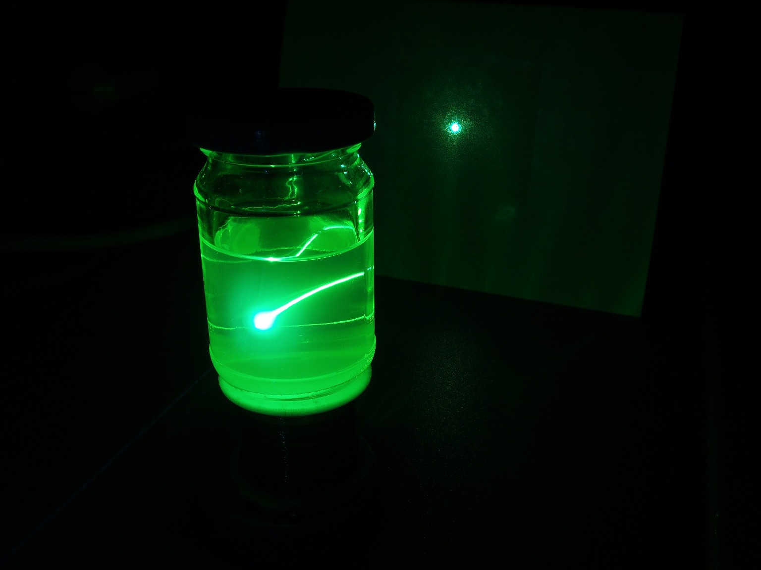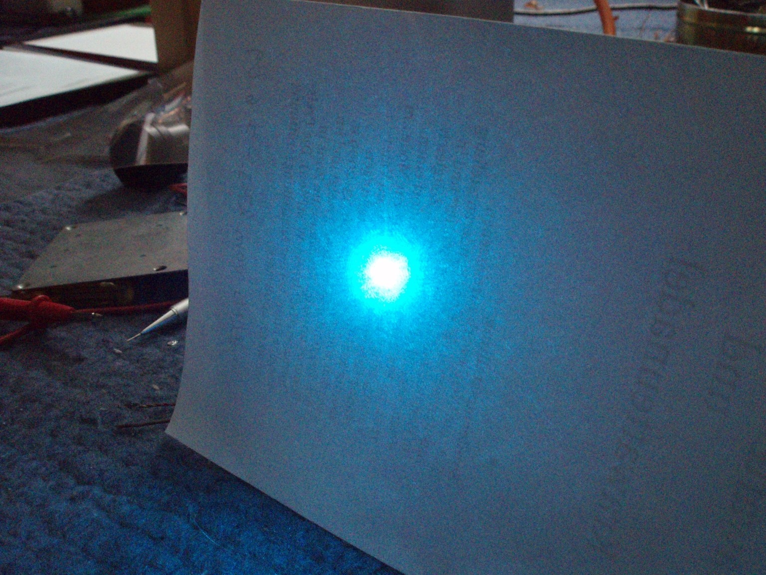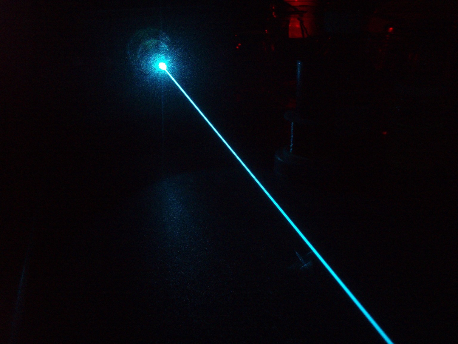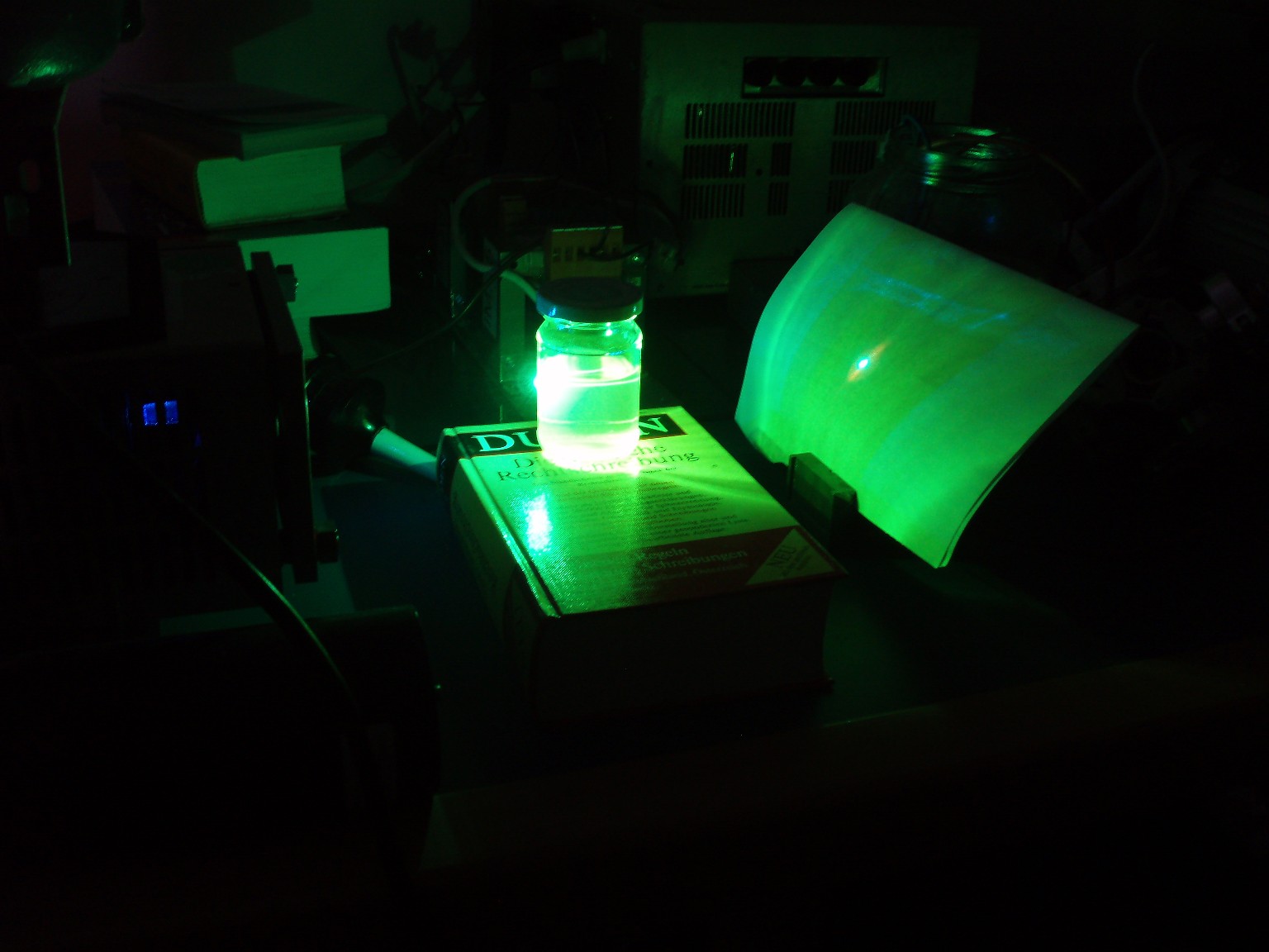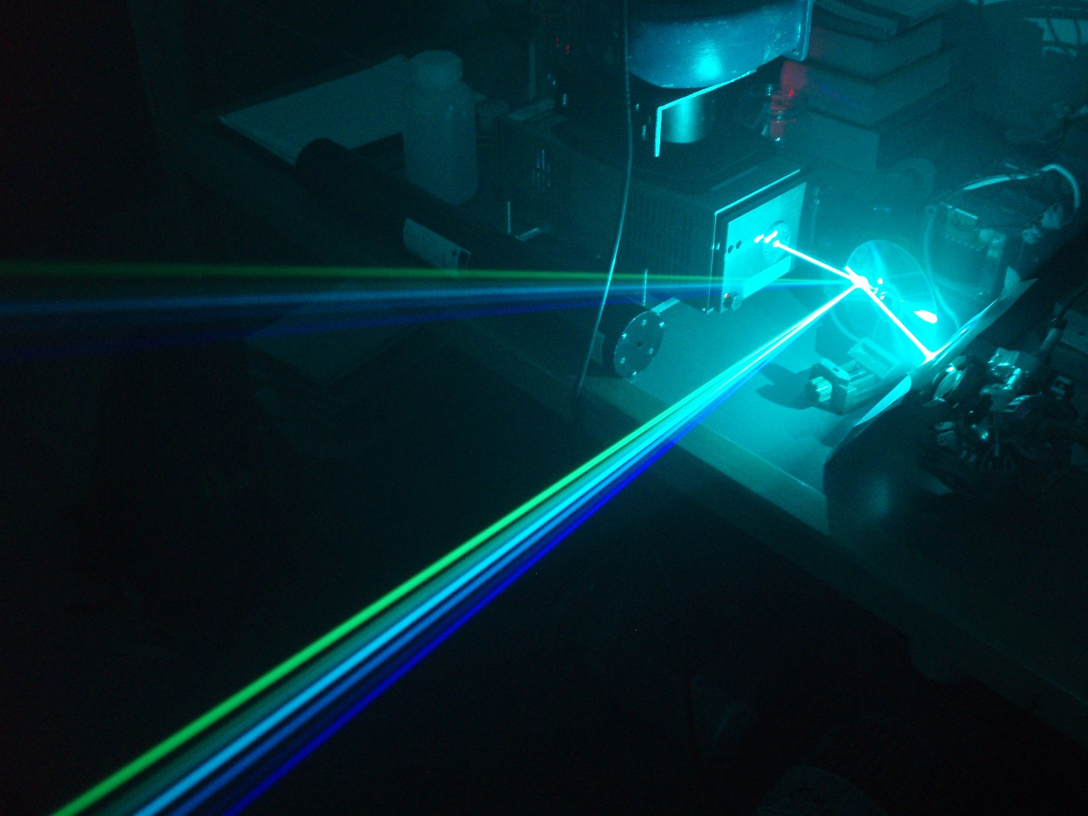Diese drei Bilder zeigen die Linien, auf denen der Laser schwingt. Auf dem ersten Foto sind nur sieben Linien zu sehen und erst wenn die Leistung höher gedreht wird (Bild 2), erscheint eine zusätzliche türkise Linie. Beim dritten Foto wurde die Leistung noch höher gedreht. Offensichtlich hats hierbei die CD angekokelt. Die Bilder geben obendrein noch am ehesten die Schönheit der Laserfarben wieder. Die grüne Linie ist bei diesem Laserkopf ausergewöhnlich stark. Selbst bei niedriger Leistung ist der grüne Spot mit dem bloßen Auge heller als die Anderen. |