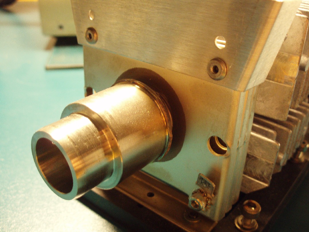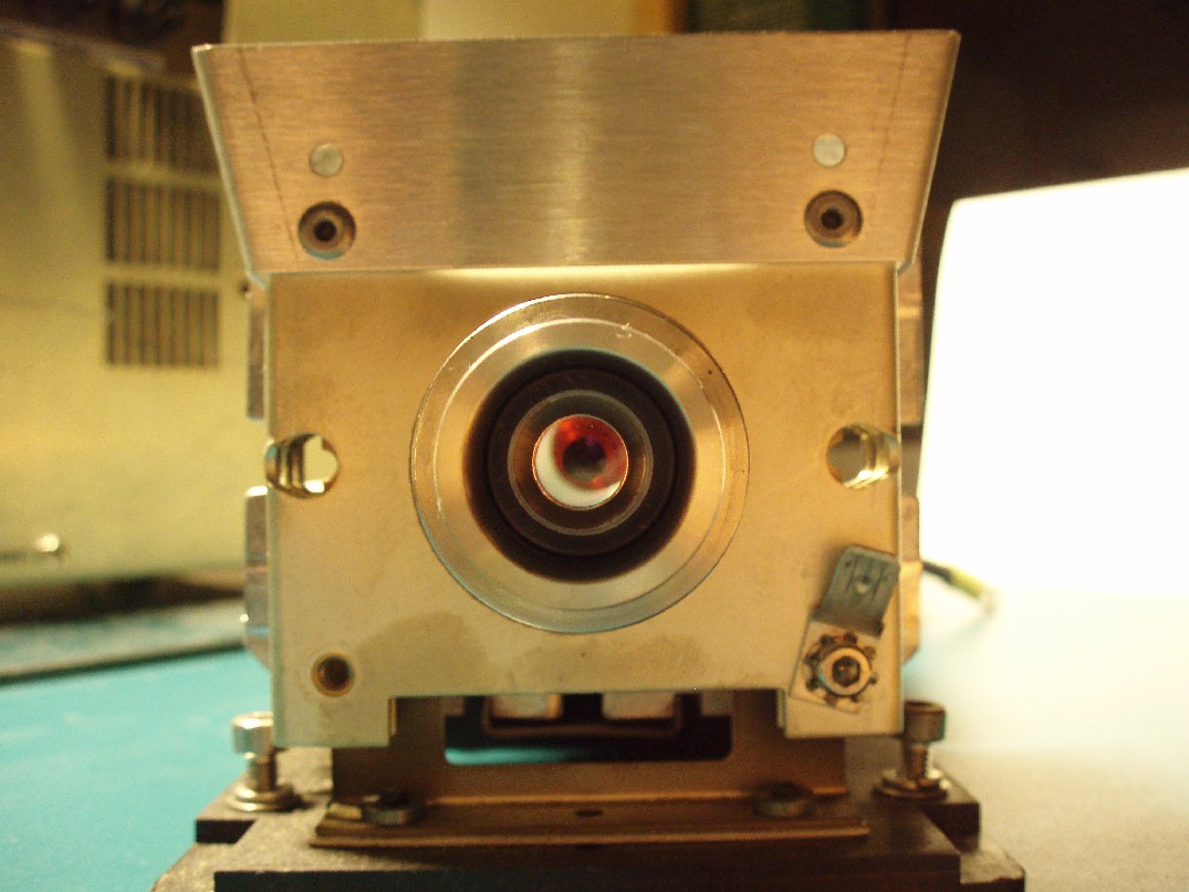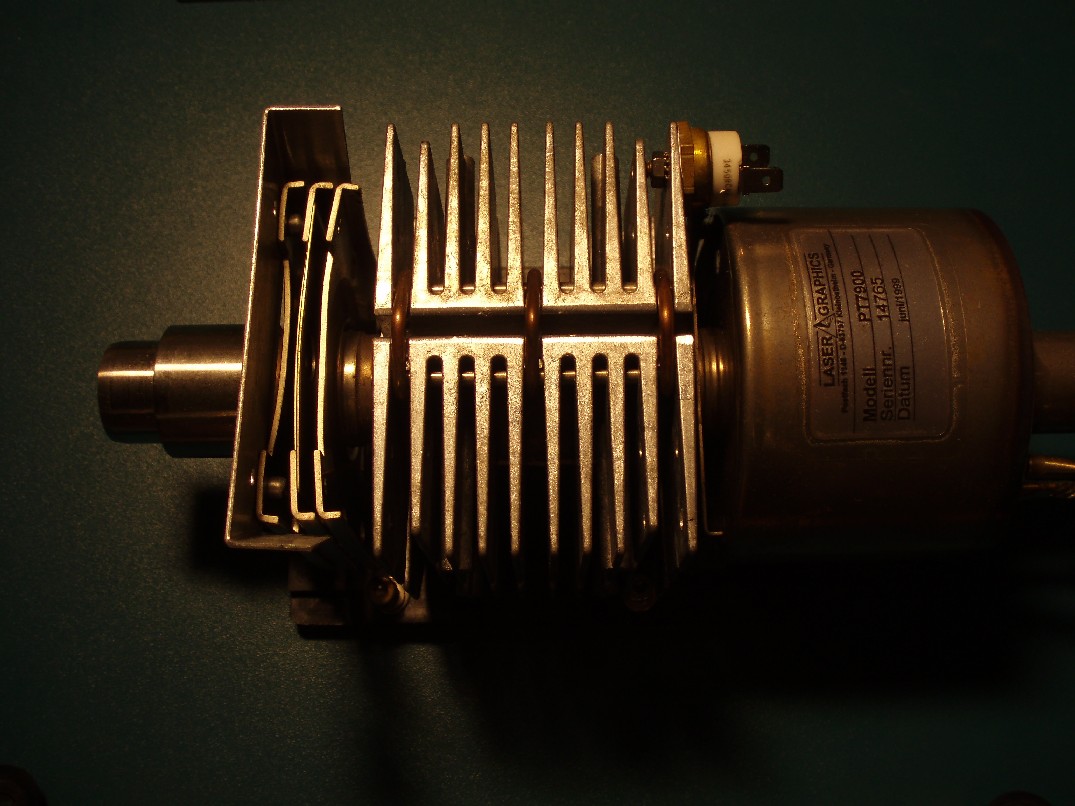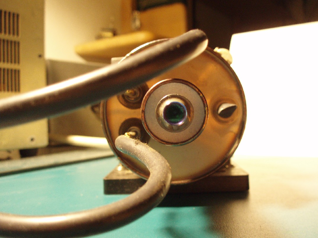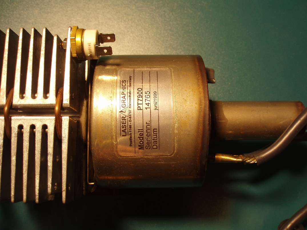 Diese kleine Argon-Laserröhre scheint defekt zu sein, aber vielleicht interessiert sich trotzdem jemand dafür und deswegen wird sie hier der Vollständigkeit halber kurz behandelt. Mit einem 8 kV-Trafo wurde getestet, ob noch irgendeine Gasentladung (keine Laserstrahlung nur Plasma) in der Röhre zu erkennen ist, um so auf den Gaszustand zu schließen. Es kam allerdings außen über den Kühlkörper zu Überschlägen und es zeigte sich keine Gasentladung im Innern. Die Ausgangsleistung dürfte wohl unter 50 mW gelegen haben. |