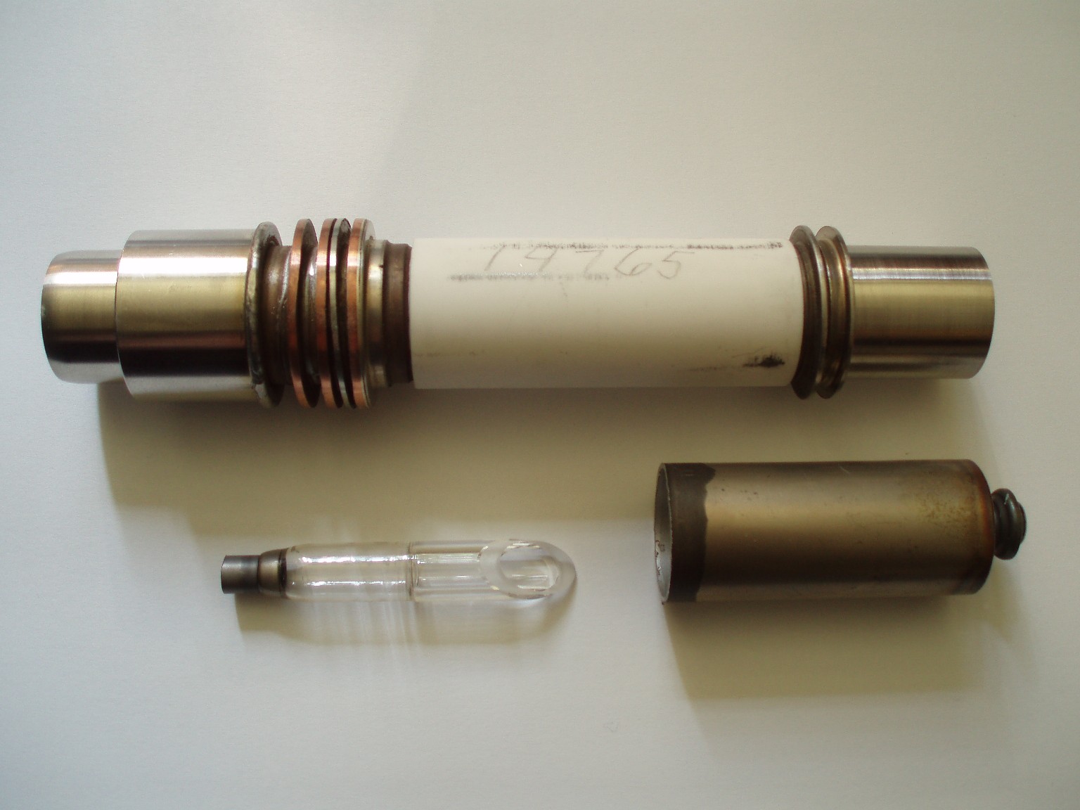 So ich hab die Röhre nun zerlegt, da sie sonst zu nichts mehr zu gebrauchen und auch nicht schön genug als Briefbeschwerer war. Dazu wurde der Pumpstutzen abgesägt. Es gab kein Zischen, was darauf hin deutet, dass die Röhre bereits auf Normaldruck war. Beim Zerlegen wurde darauf geachtet, die Beryllium-Oxid-Röhre nicht zu beschädigen. |