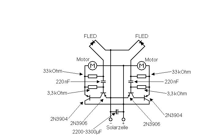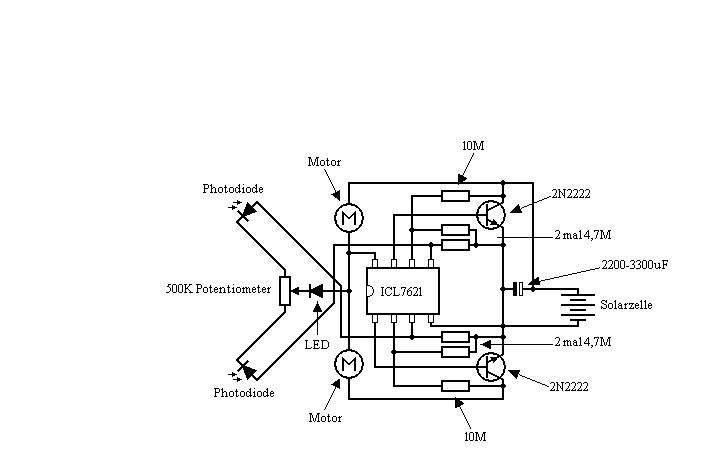 Dieser Bot soll dem Licht folgen. PD sagt blos aus, dass dieser Roboter nicht mit den häufig verwendeten FLEDs (flashing ELDs), sondern mit normalen Photodioden läuft. Hier ist der Schaltplan für diesen Bot. |