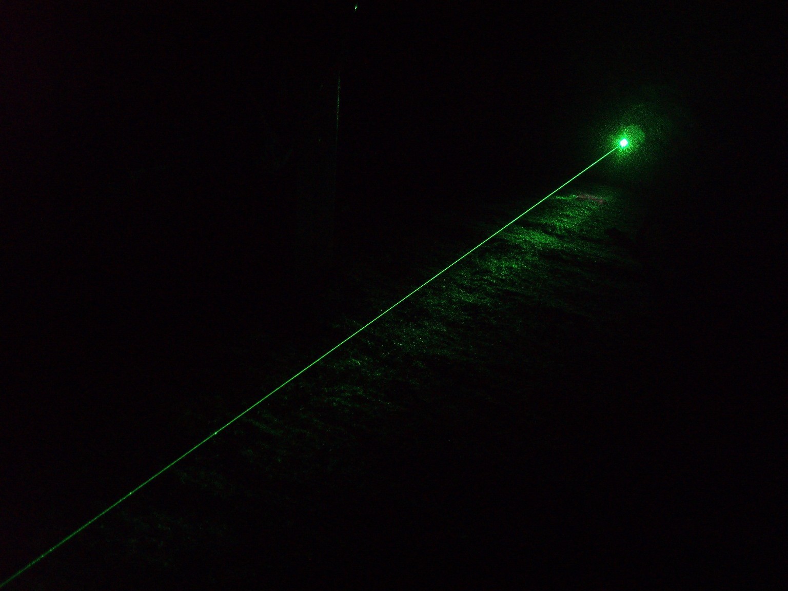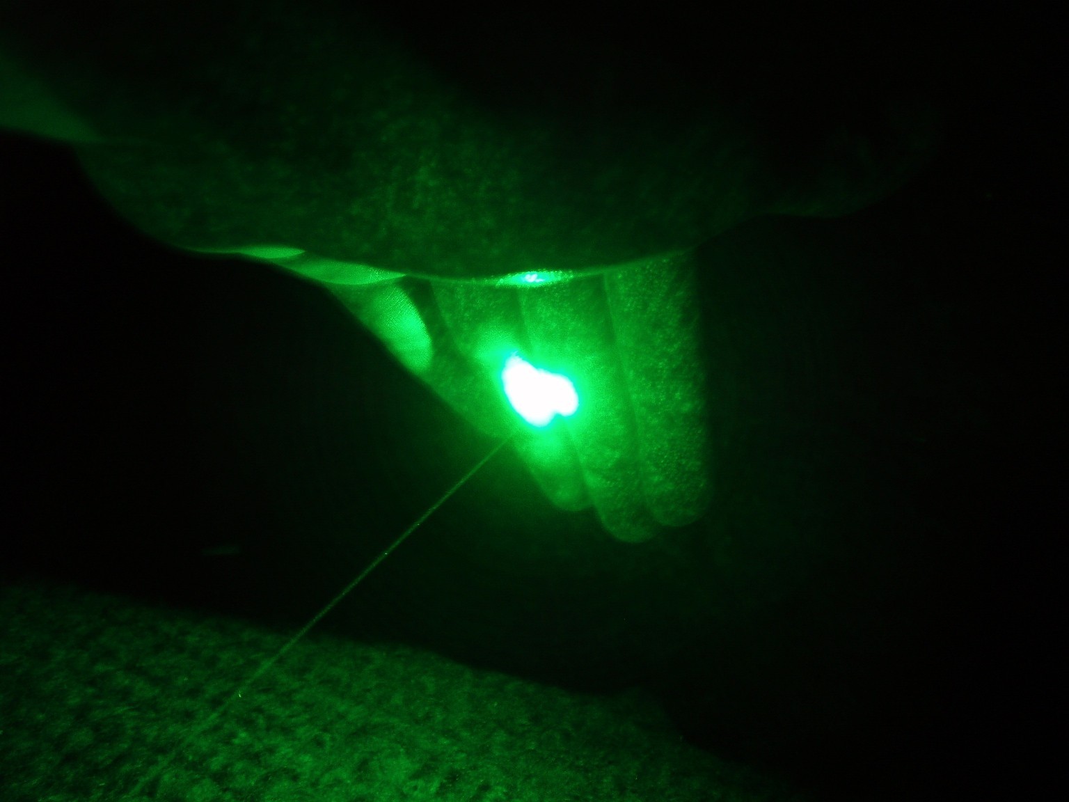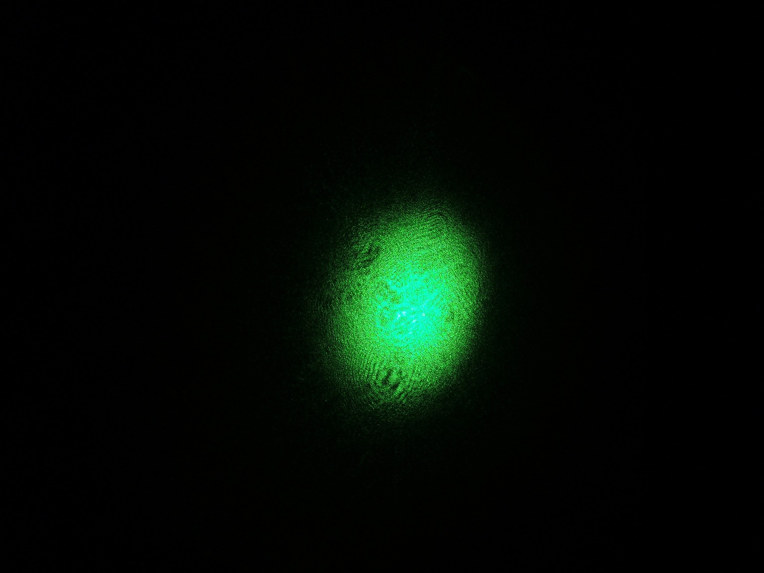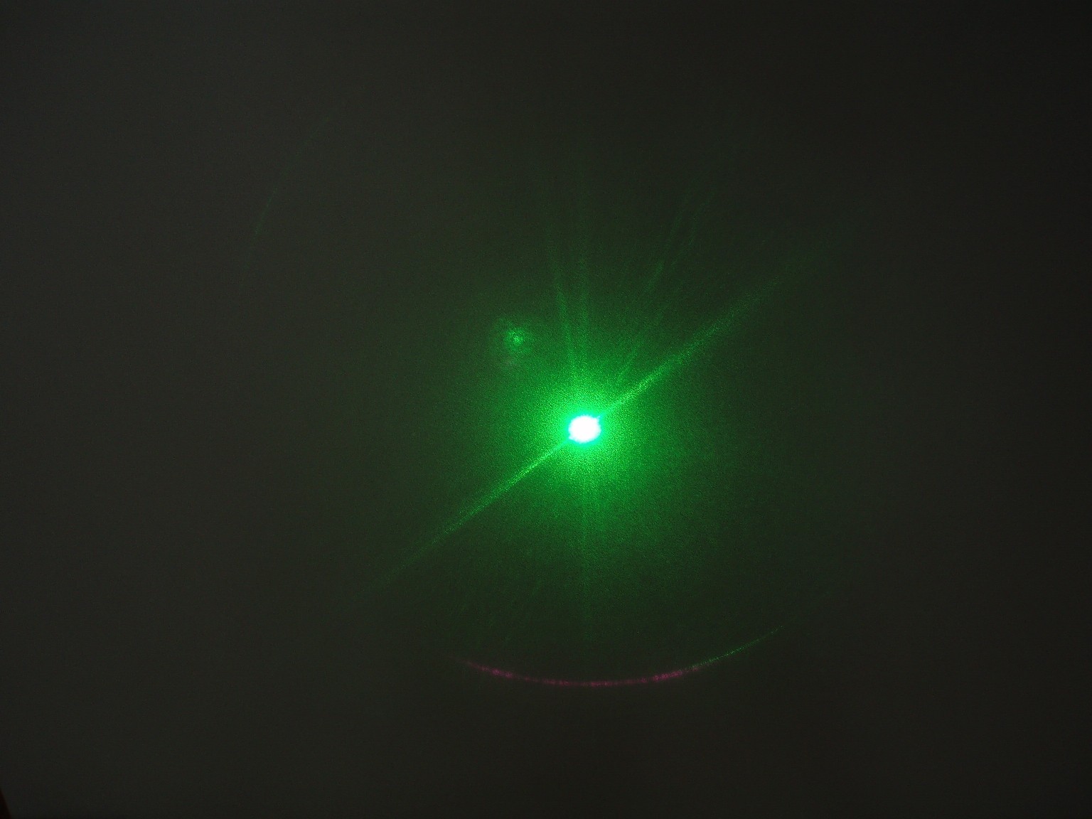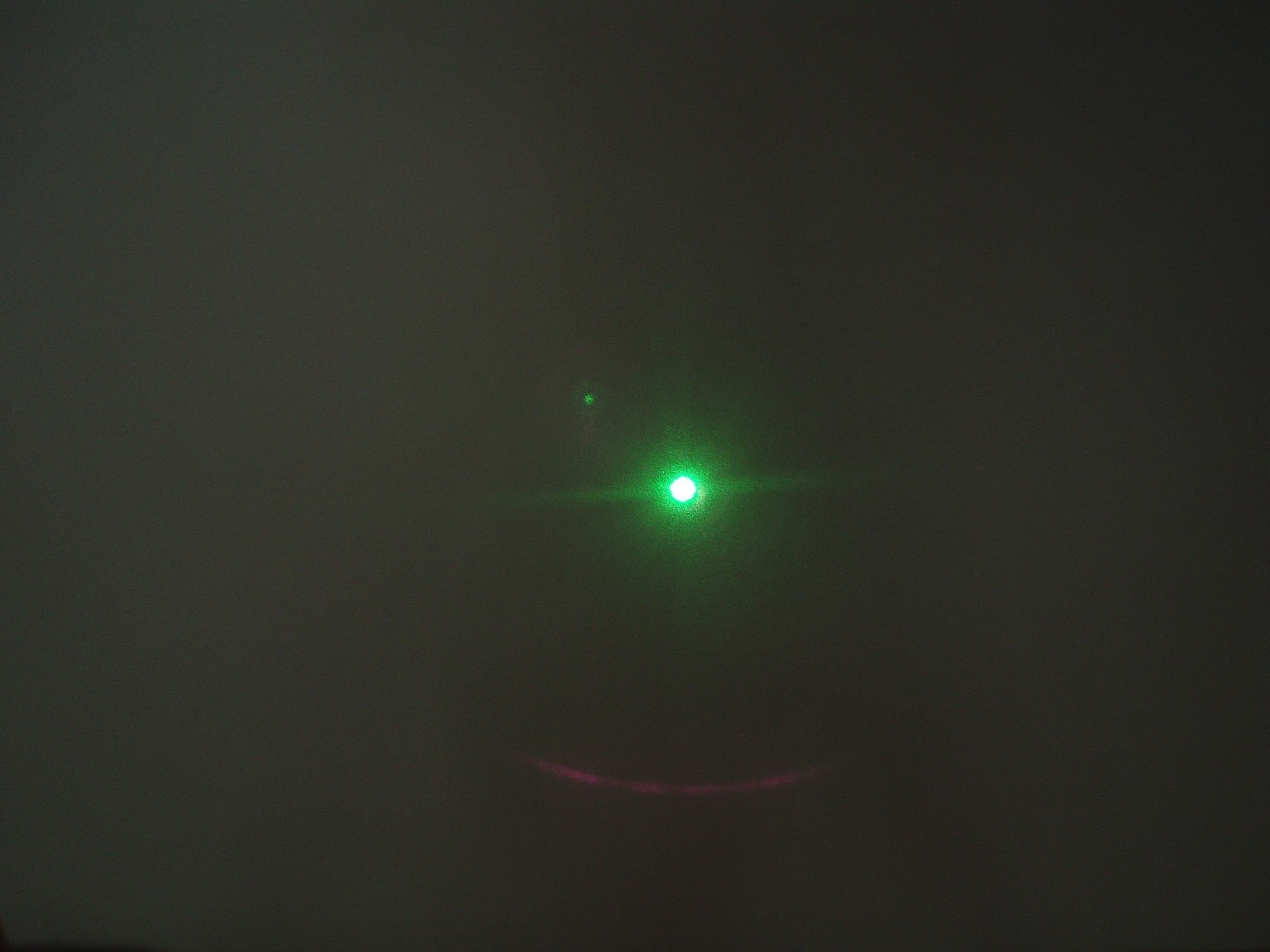 Diese drei Bilder zeigen den Laserspot, nachdem der Strahl einen Polarisationsfilter passiert hat. Unter dem Spot ist der Rest der infraroten Pumpstrahlung zu erkennen. |