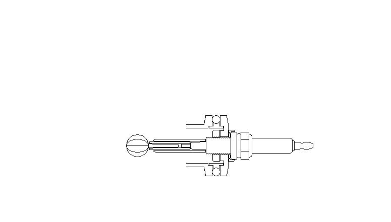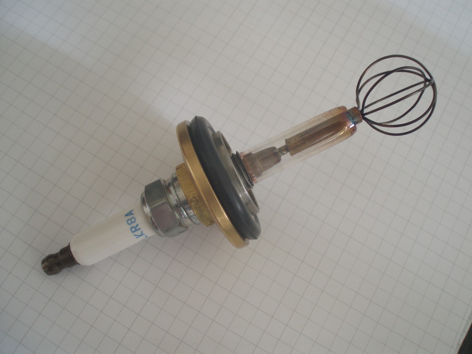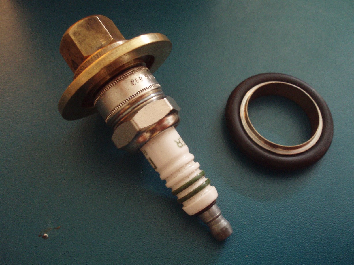 Das Gewinde der Zündkerze wurde vorsichtig in der Hälfte rund um den Keramikteil abgesägt und entfernt. Der Metallring am Gewinde wurde ebenfalls entfernt. In einen KF25-Messing-Blindflansch wurde zentral ein 12 mm großes Loch gebohrt. Die Zündkerze wurde mit einem Dichtungsring versehen und durch die Bohrung im Flansch hindurch geführt. Als Gegenmutter dient eine G12 Messingmutter, die zuvor halbiert worden war. Da diese Muttern nicht auf die Zündkerze passen, musste eine der halbierten Muttern beidseitig kegelförmig ausgeschliffen werden. Die andere Hälfte der Mutter wurde einseitig kegelförmig ausgeschliffen und findet als Zentrierring für den Dichtungsring Verwendung, da dieser sonst durch den Anpressdruck aus seiner Position gequetscht würde. |