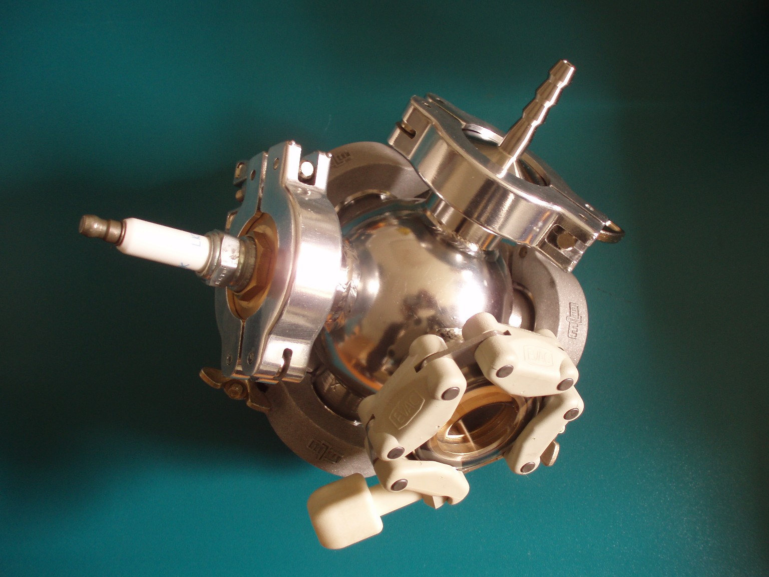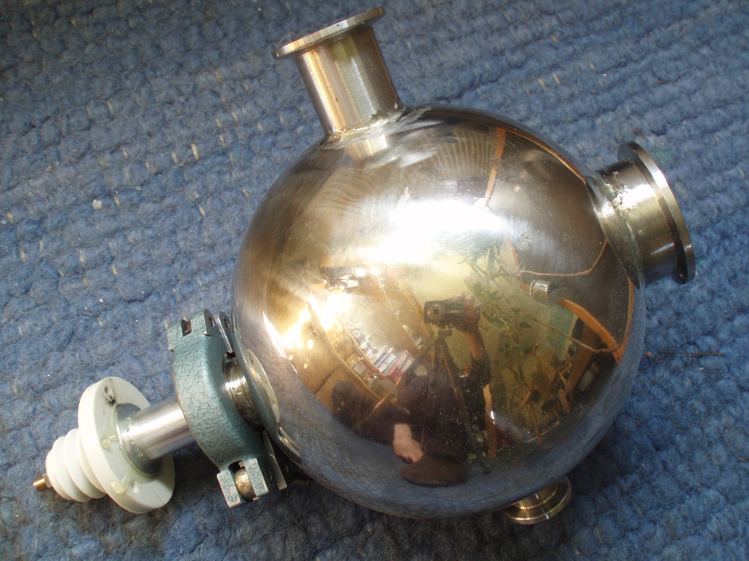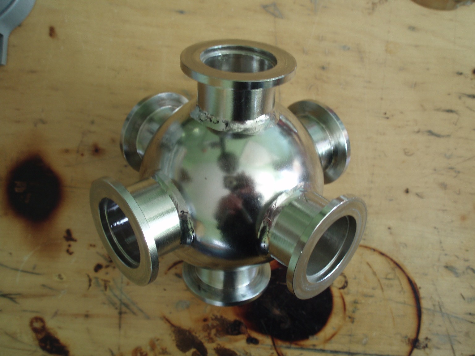 Die Kammer ist aus einem kugelförmigen Vakuumverteiler aus Edelstahl aufgebaut. Bei den sechs Anschlüssen handelt es sich um KF25-Klammerflansche die im 90-Grad-Winkel zueinander (also gleichmäßig) um die Kugel verteilt sind. Der Innendurchmesser der Kugel beträgt etwa 6,5 cm bei einer Wandstärke von etwa 2,5 mm. |
