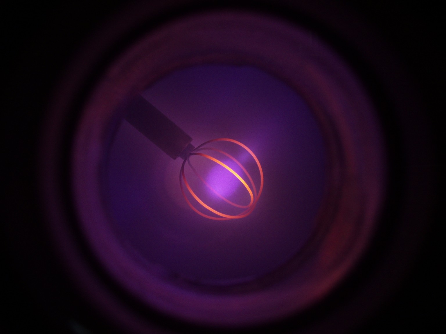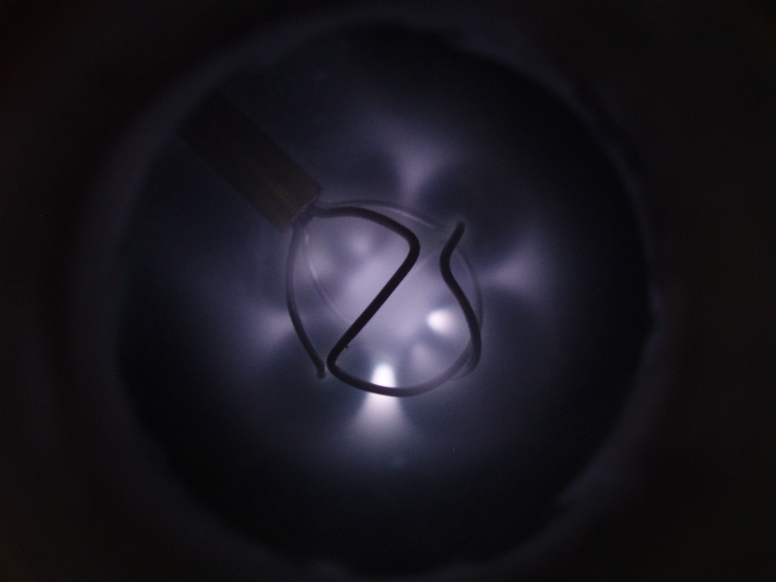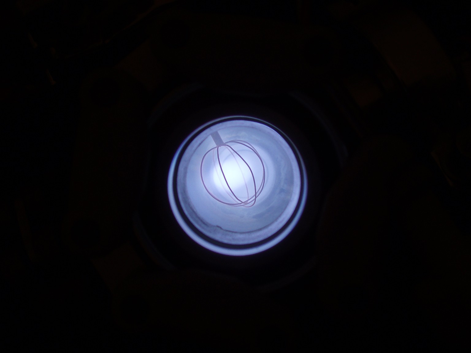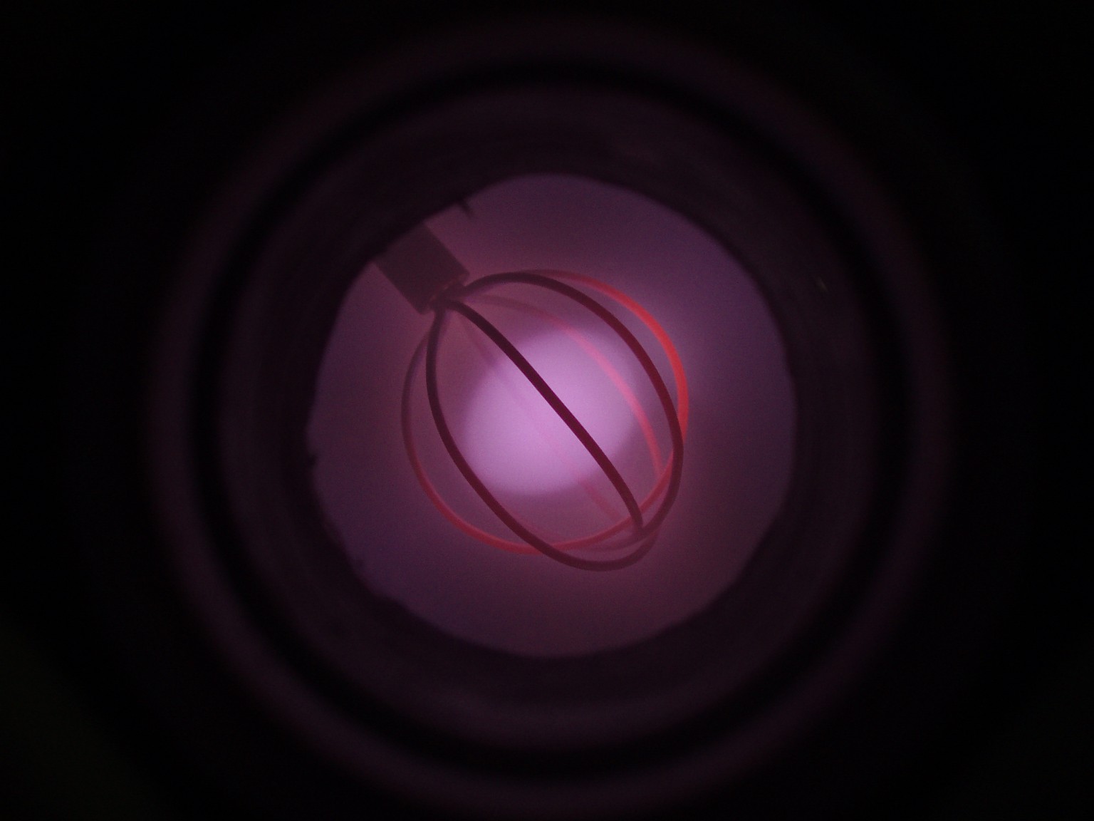 Das Aussehen der Entladung im Innern eines Fusors hängt von verschiedenen Faktoren ab. Einer dieser Faktoren ist die Form des Gitters. Ein weiterer ist der Druck, der bei den folgenden Bildern deutlich höher als bei einem richtigen Fusor ist. Sobald es mir gelungen ist ein besseres Vakuum zu erreichen, folgen weitere Bilder. |