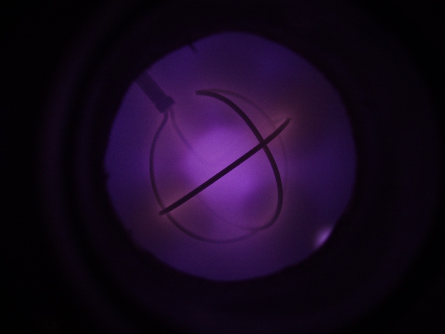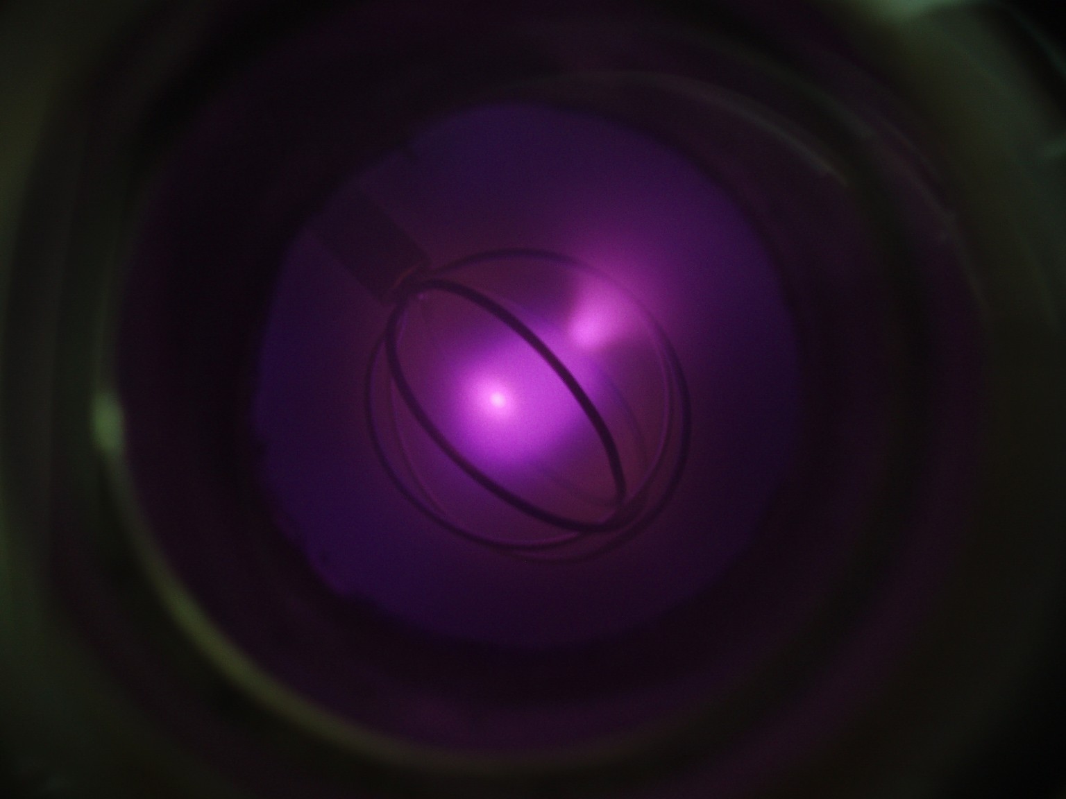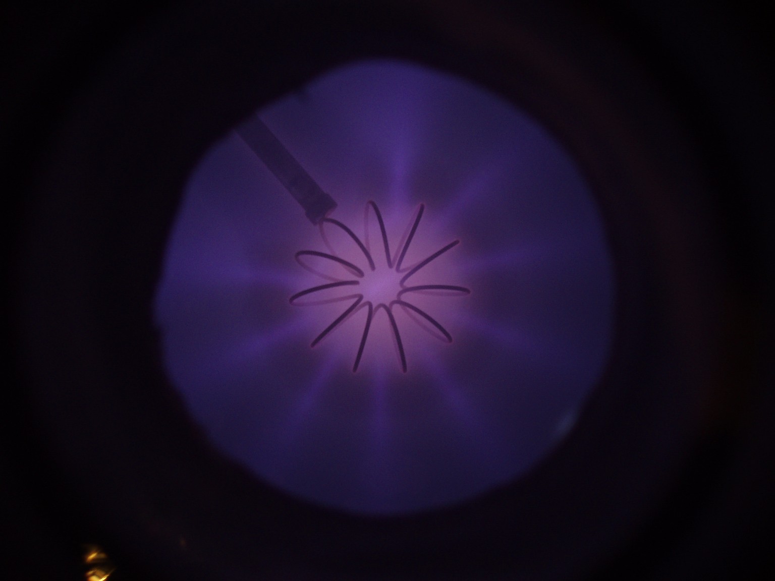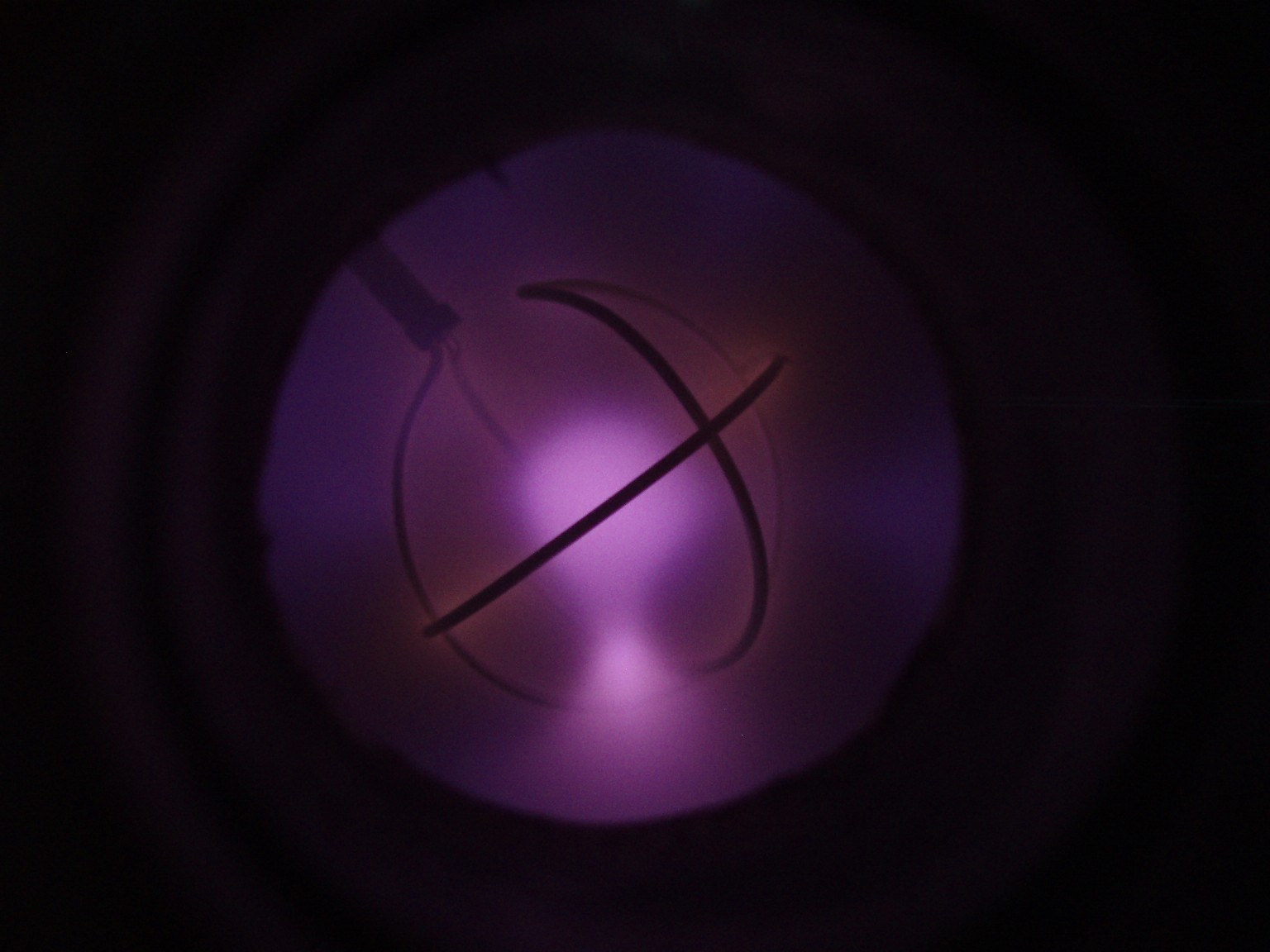 Das Aussehen der Entladung im Innern eines Fusors hängt von verschiedenen Faktoren ab. Einer dieser Faktoren ist die Form des Gitters. Ein weiterer ist der Druck, der bei den folgenden Bildern deutlich höher als bei einem richtigen Fusor ist. Sobald es mir gelungen ist ein besseres Vakuum zu erreichen, folgen weitere Bilder. |