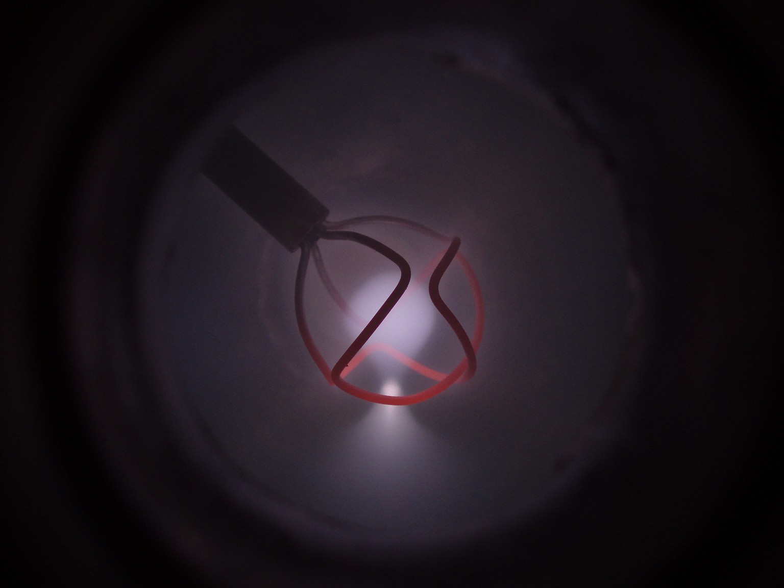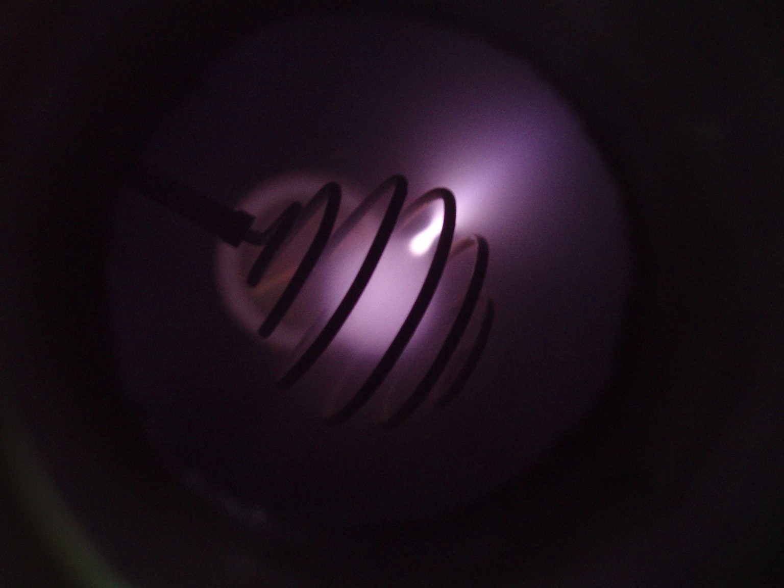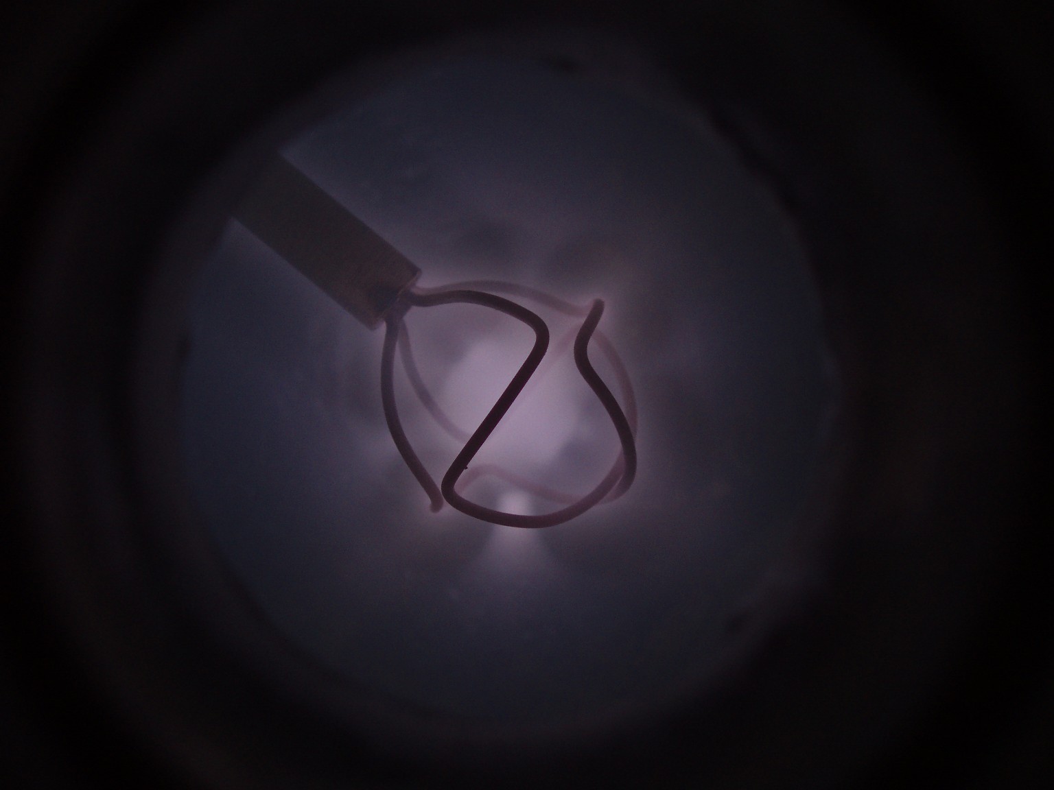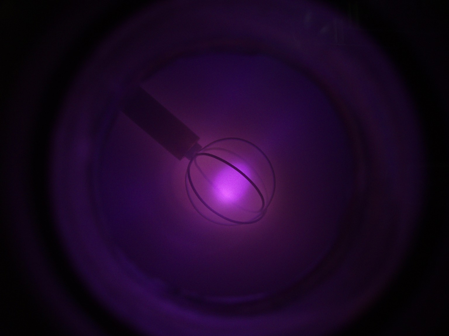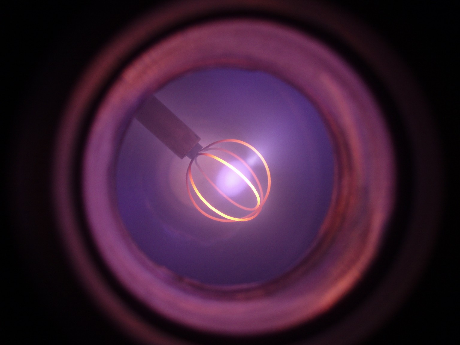 Das Aussehen der Entladung im Innern eines Fusors hängt von verschiedenen Faktoren ab. Einer dieser Faktoren ist die Form des Gitters. Ein weiterer ist der Druck, der bei den folgenden Bildern deutlich höher als bei einem richtigen Fusor ist. Sobald es mir gelungen ist ein besseres Vakuum zu erreichen, folgen weitere Bilder. |