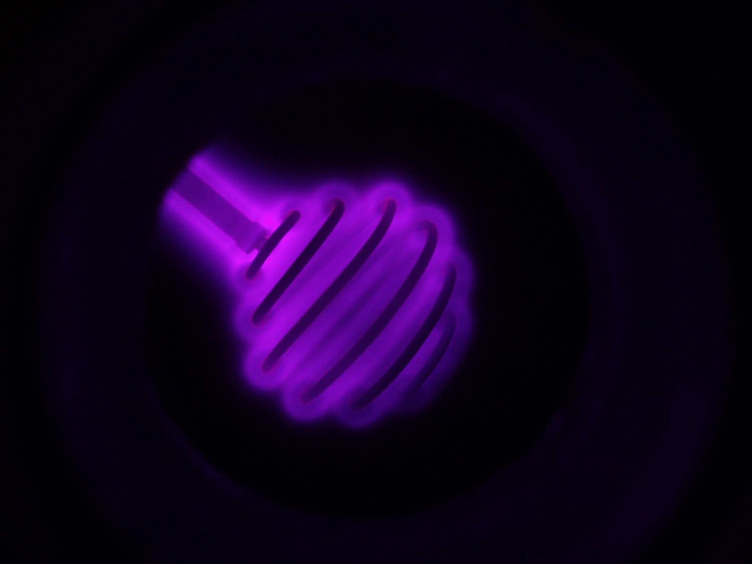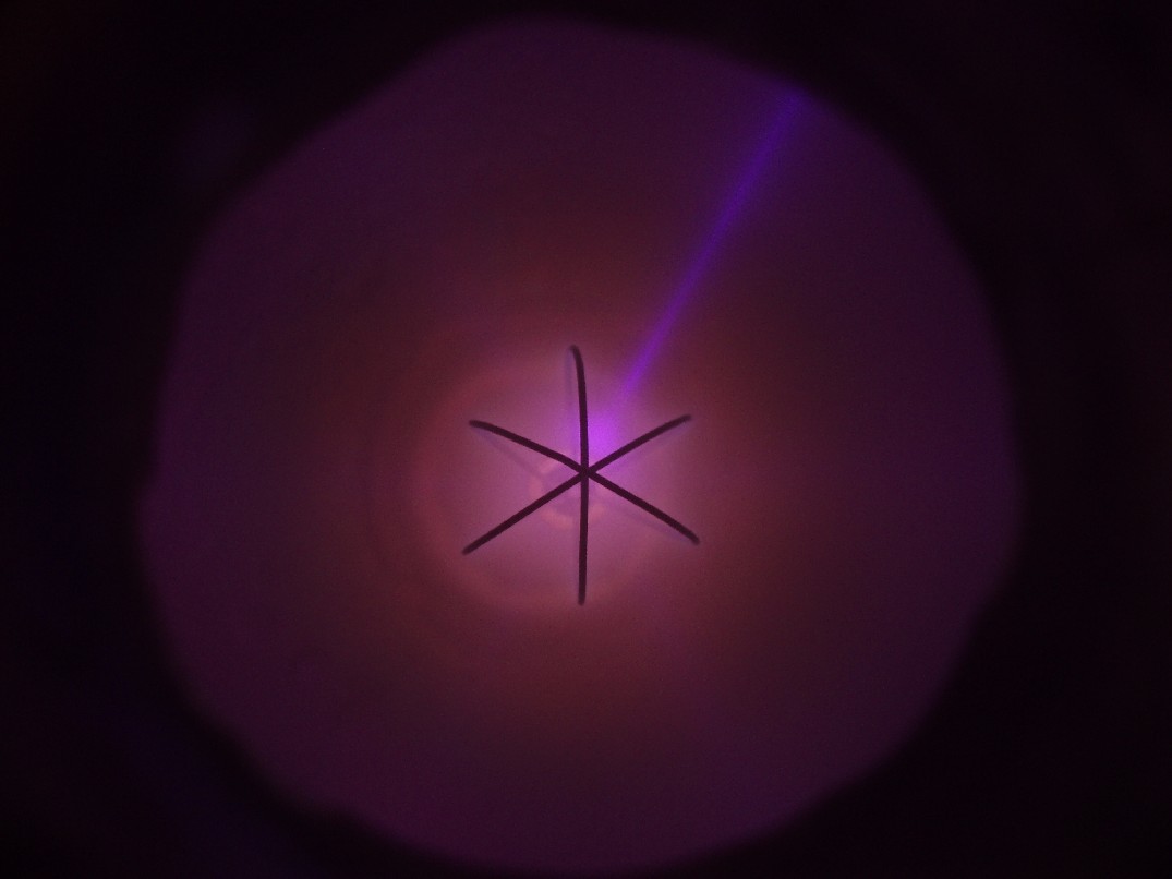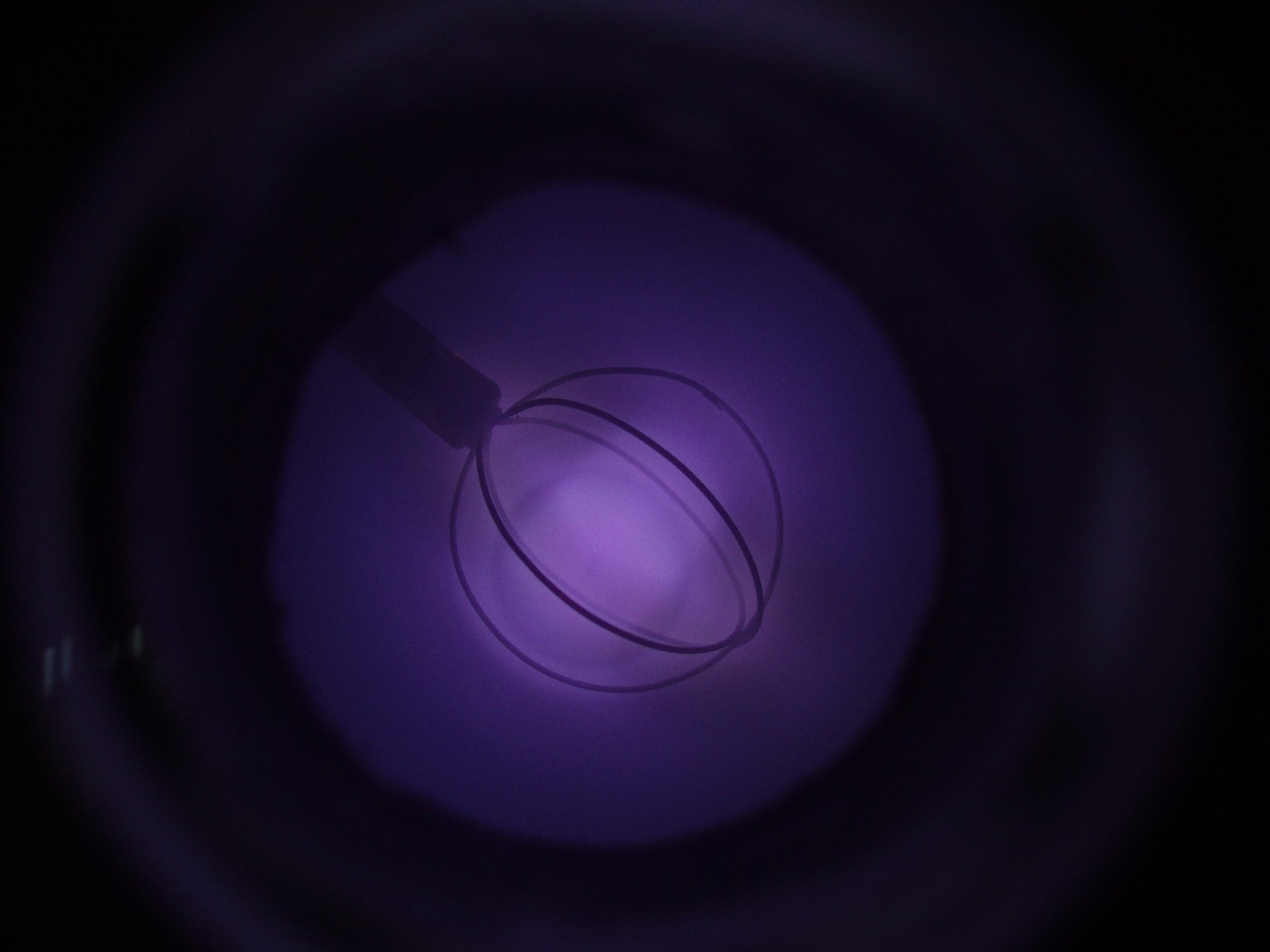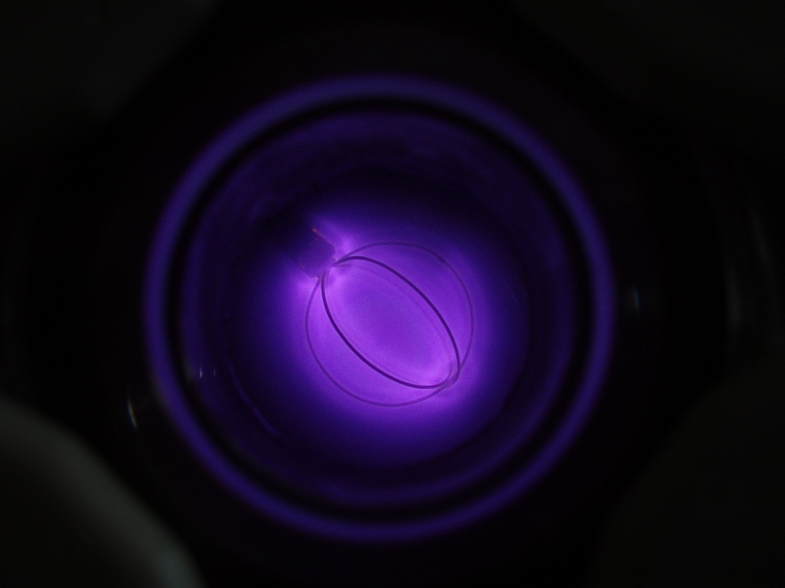 Das Aussehen der Entladung im Innern eines Fusors hängt von verschiedenen Faktoren ab. Einer dieser Faktoren ist die Form des Gitters. Ein weiterer ist der Druck, der bei den folgenden Bildern deutlich höher als bei einem richtigen Fusor ist. Sobald es mir gelungen ist ein besseres Vakuum zu erreichen, folgen weitere Bilder. |