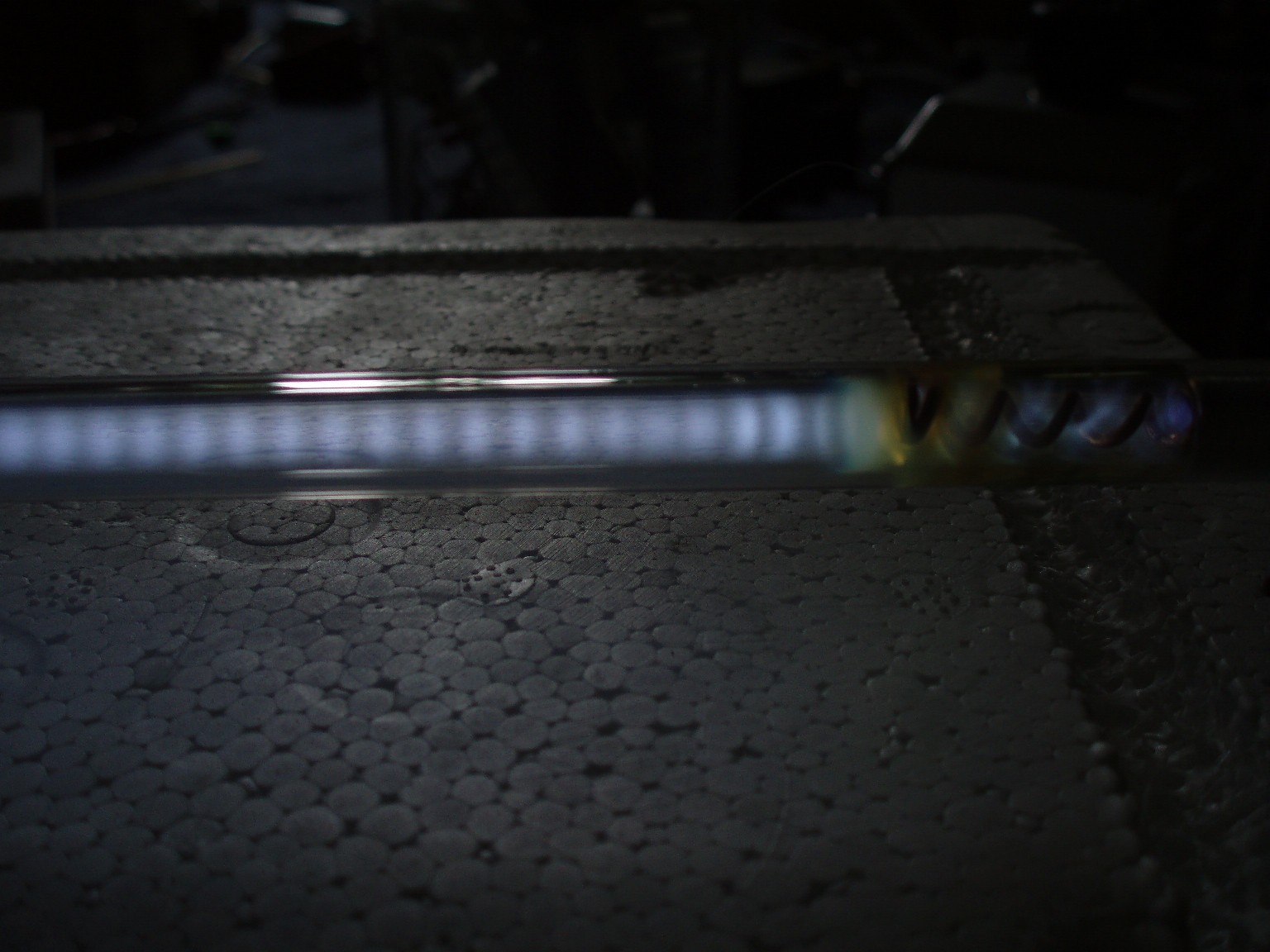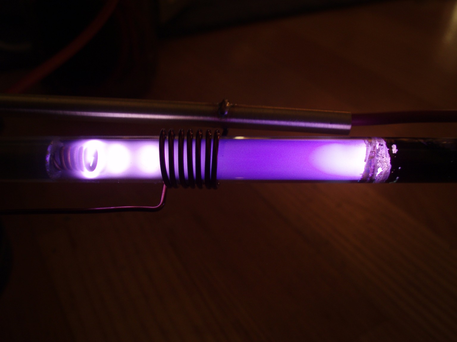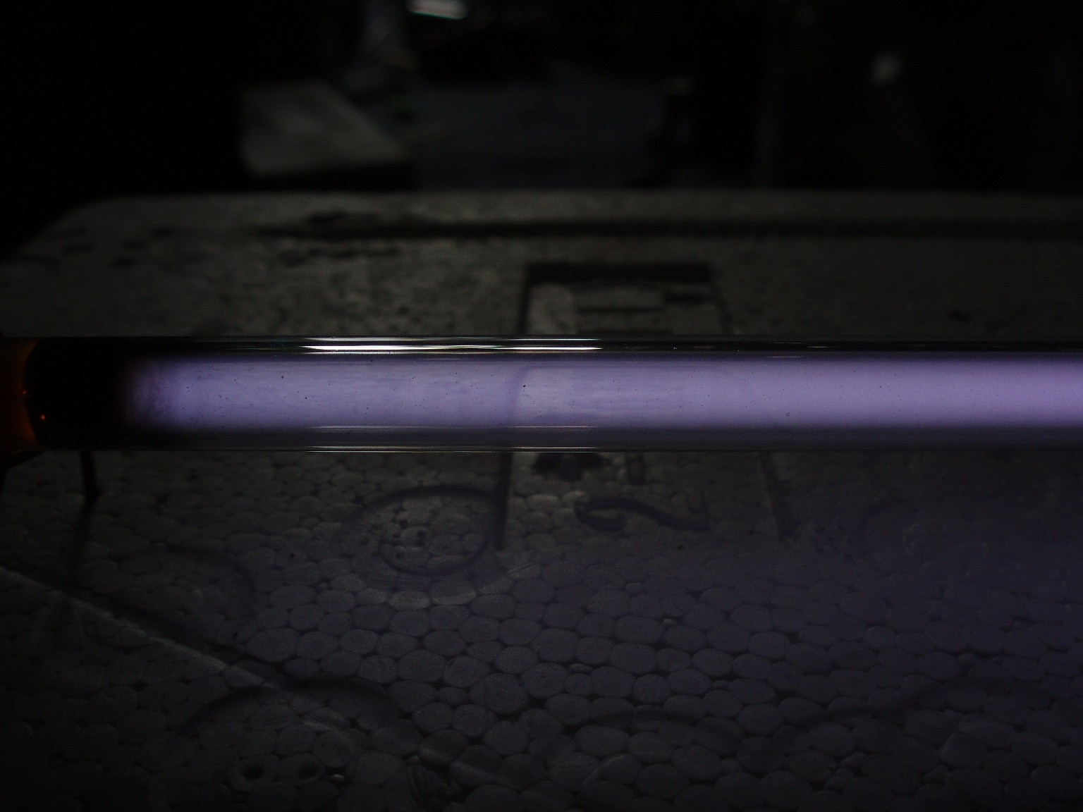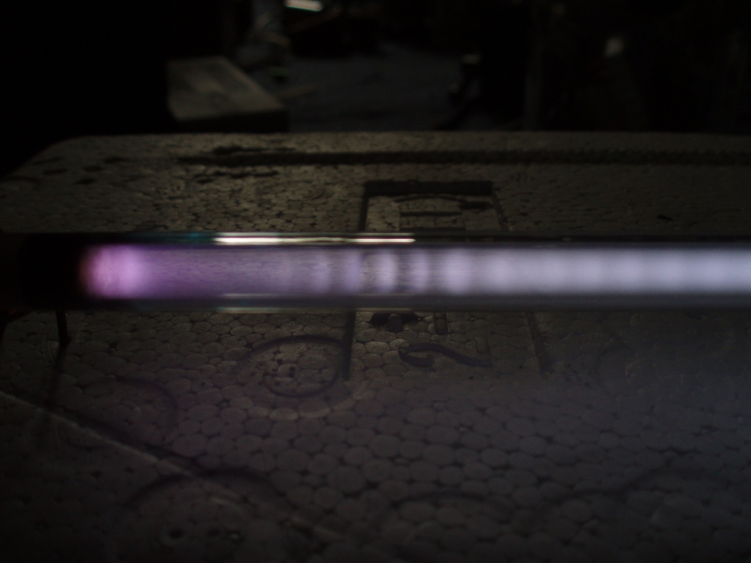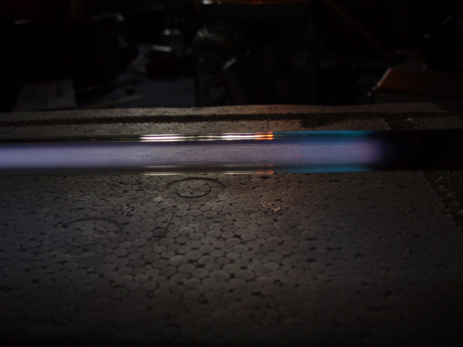Anfänglich war die Entladungsröhre nur ein Test für die Vakuumpumpe, aber nach und nach wurden weitere Versionen konstruiert (nicht alles wird hier behandelt), um bestimmte Erscheinungen genauer beobachten zu können. Die Röhren sind aus Borosilikatglas gefertigt und haben einen Innendurchmesser von ca. 8mm. Die Dinger werden sauheiß! |