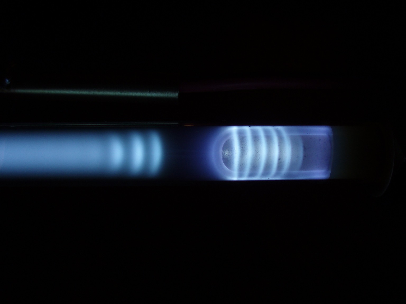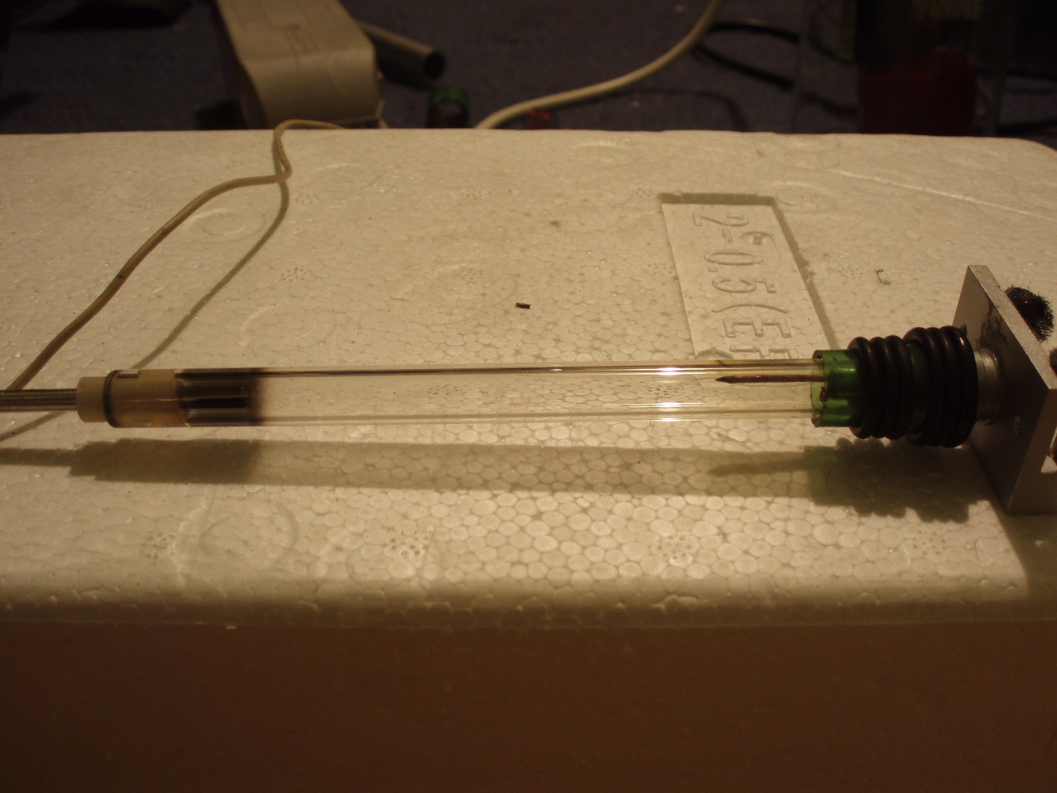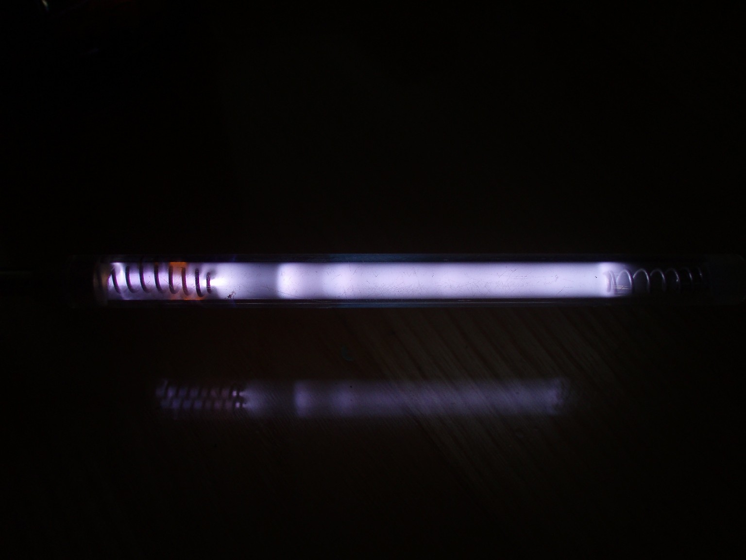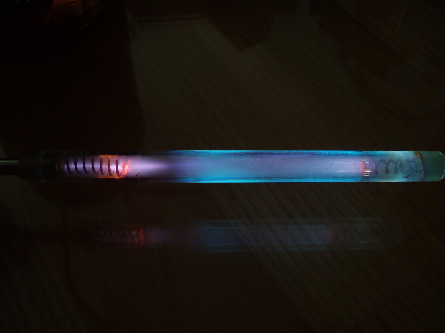 Anfänglich war die Entladungsröhre nur ein Test für die Vakuumpumpe, aber nach und nach wurden weitere Versionen konstruiert (nicht alles wird hier behandelt), um bestimmte Erscheinungen genauer beobachten zu können. Die Röhren sind aus Borosilikatglas gefertigt und haben einen Innendurchmesser von ca. 8mm. Die Dinger werden sauheiß! |