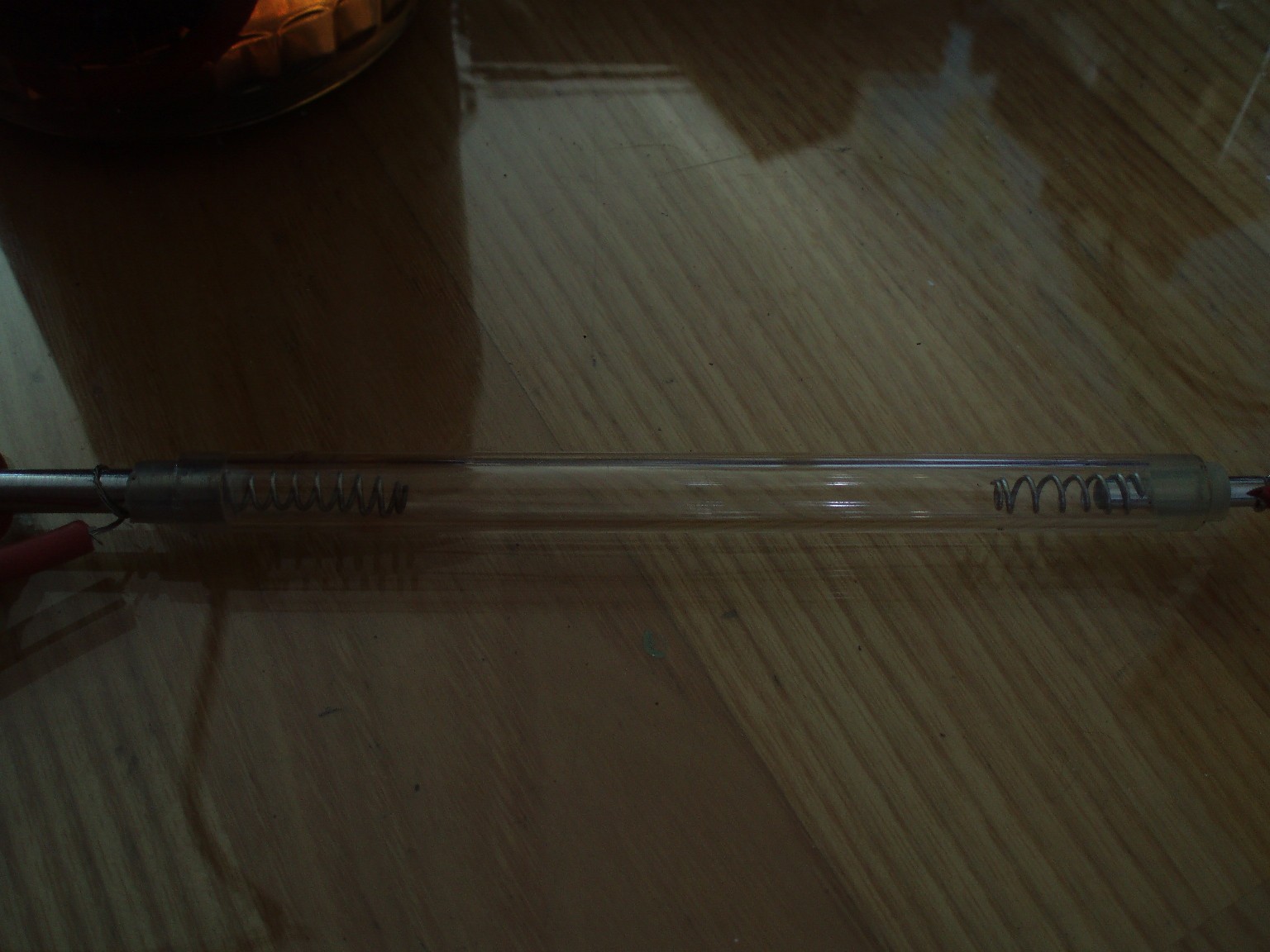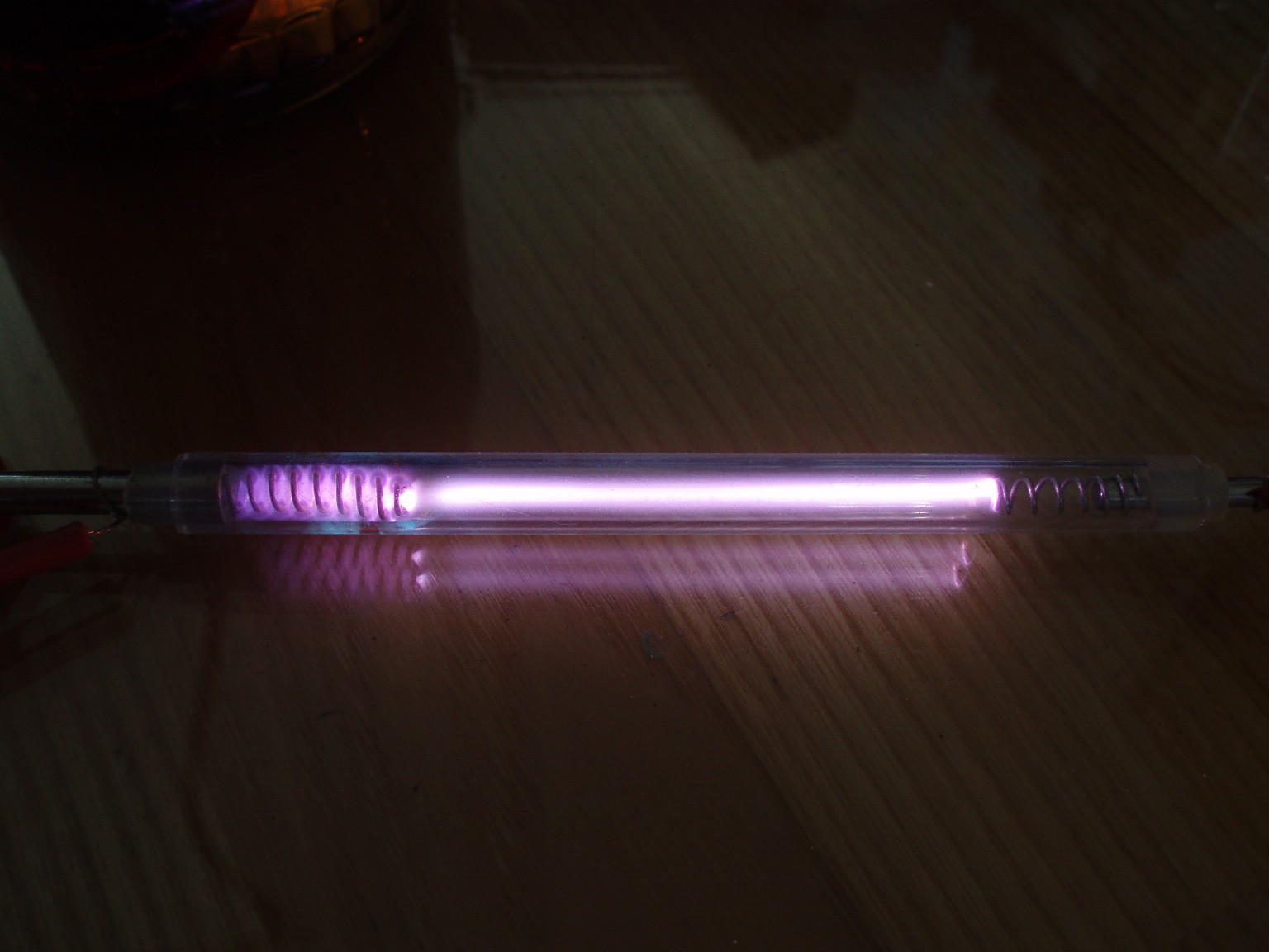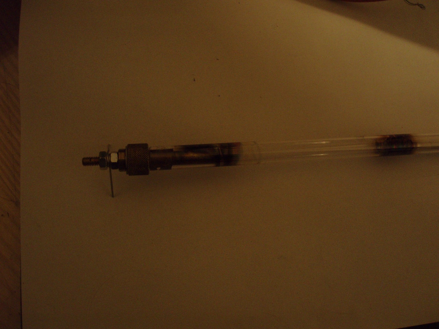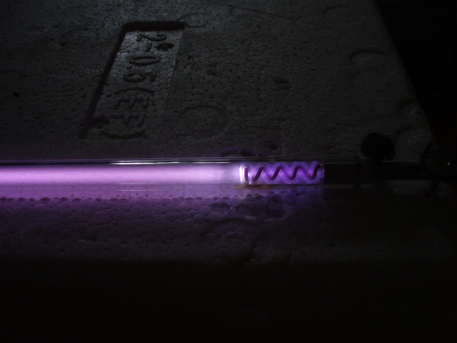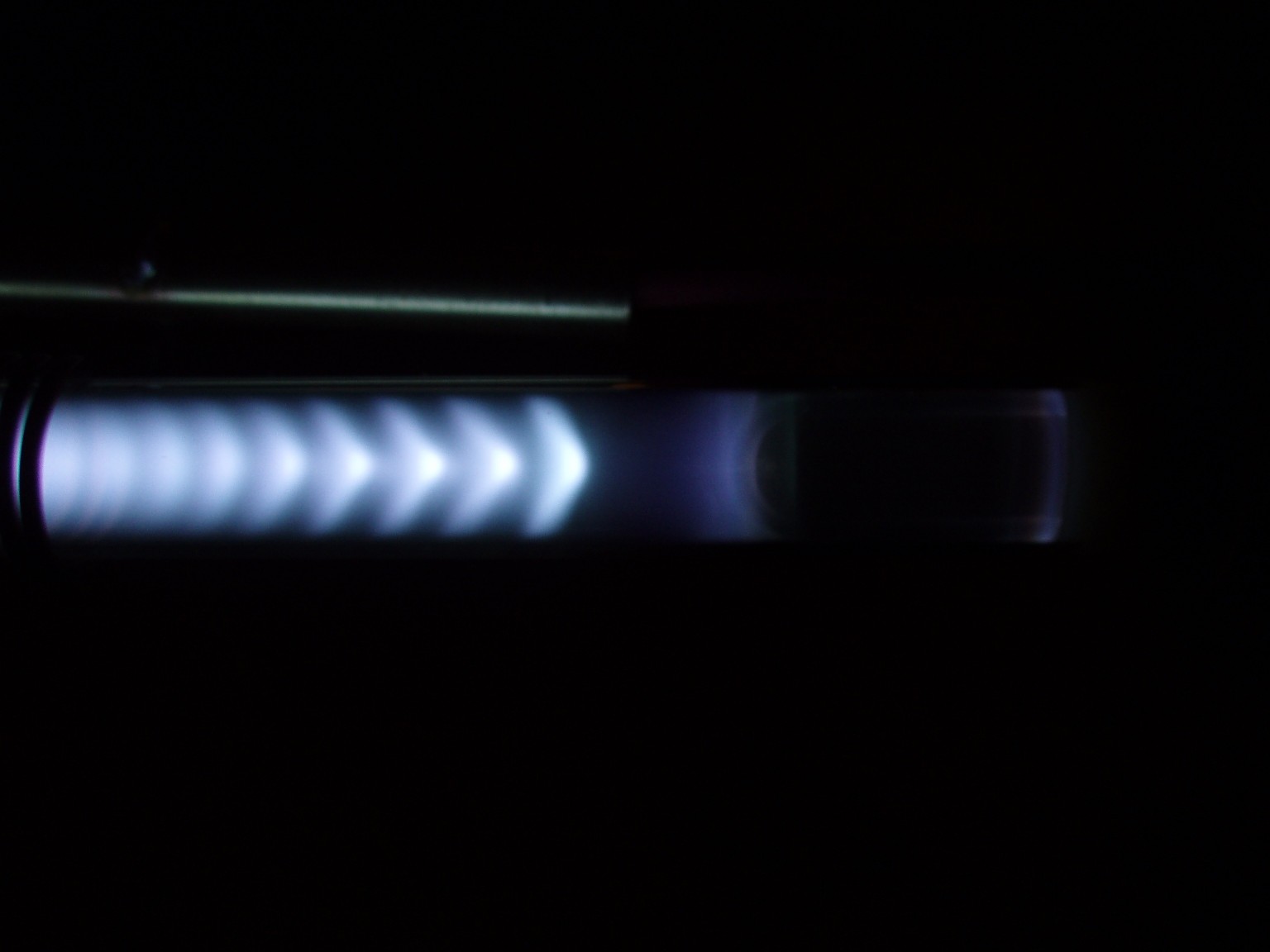 Anfänglich war die Entladungsröhre nur ein Test für die Vakuumpumpe, aber nach und nach wurden weitere Versionen konstruiert (nicht alles wird hier behandelt), um bestimmte Erscheinungen genauer beobachten zu können. Die Röhren sind aus Borosilikatglas gefertigt und haben einen Innendurchmesser von ca. 8mm. Die Dinger werden sauheiß! |