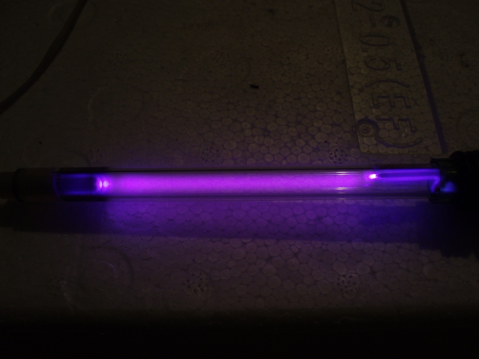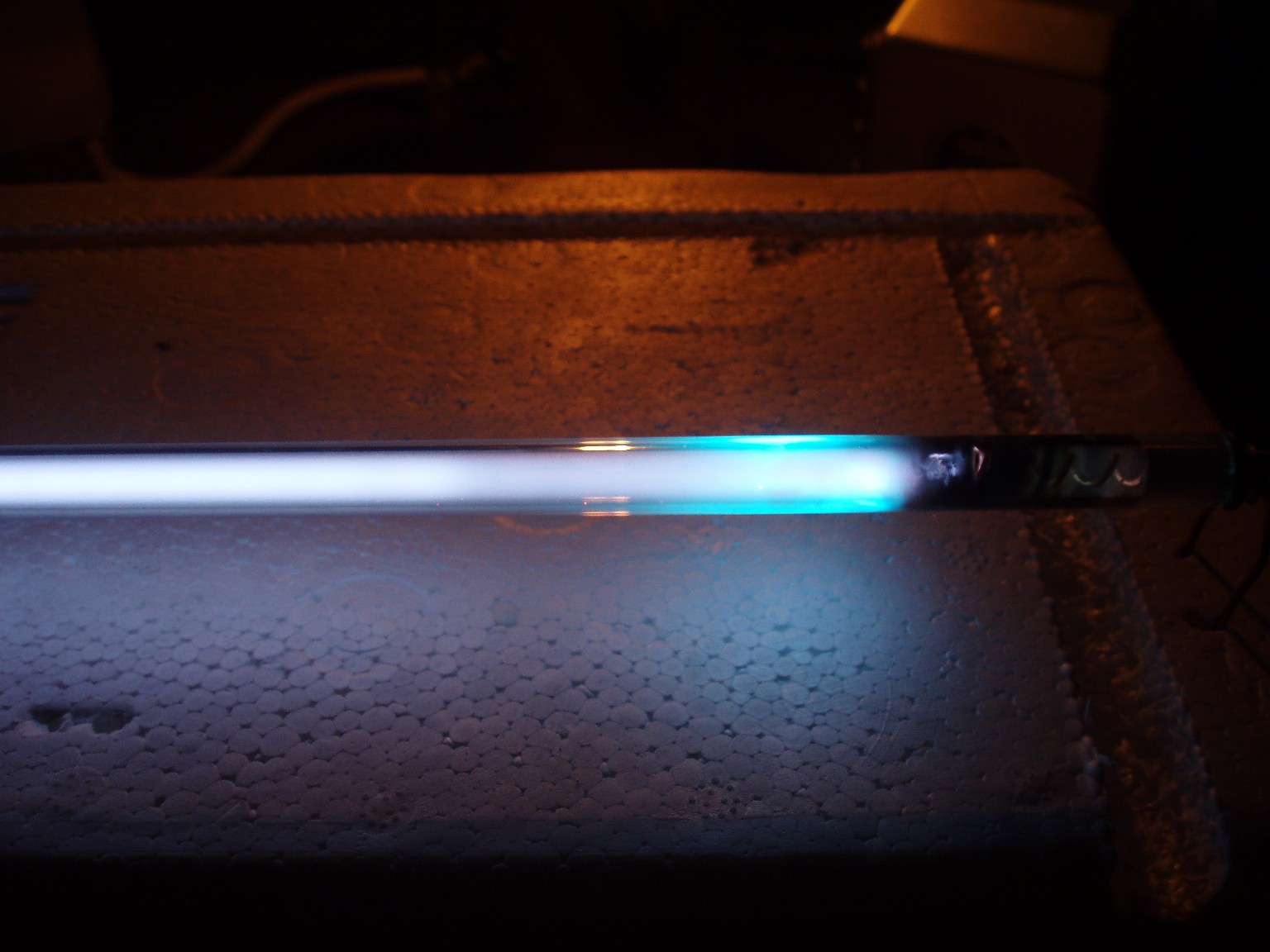 Die folgenden vier Bilder zeigen die Röhre bei sinkendem Druck. Die Fluoreszenz rührt zumindest zu einem Teil von Röntgenstrahlung, die sich mit einem einfachen Testaufbau nachweisen ließ. |