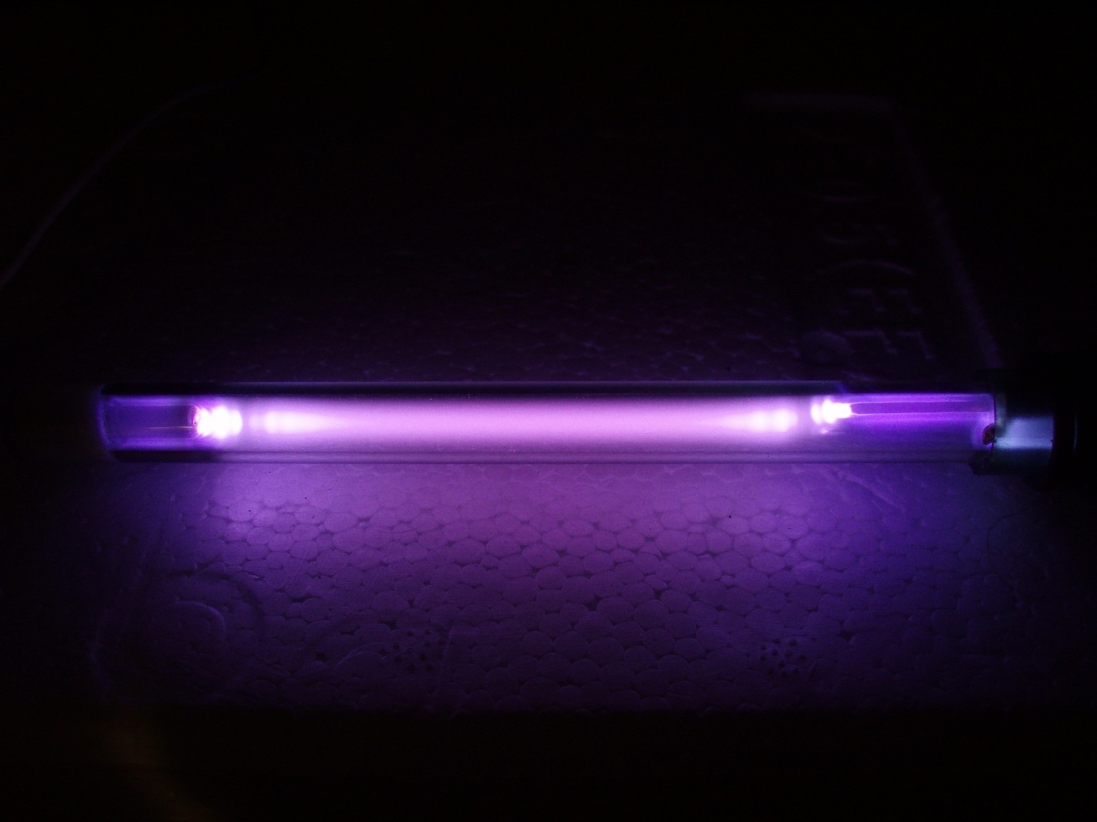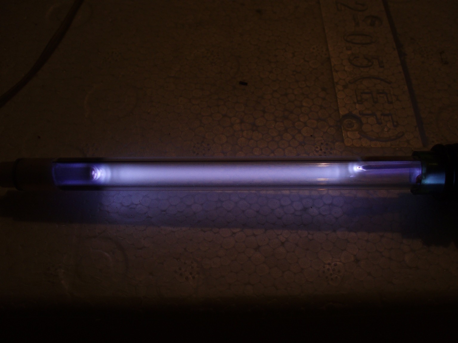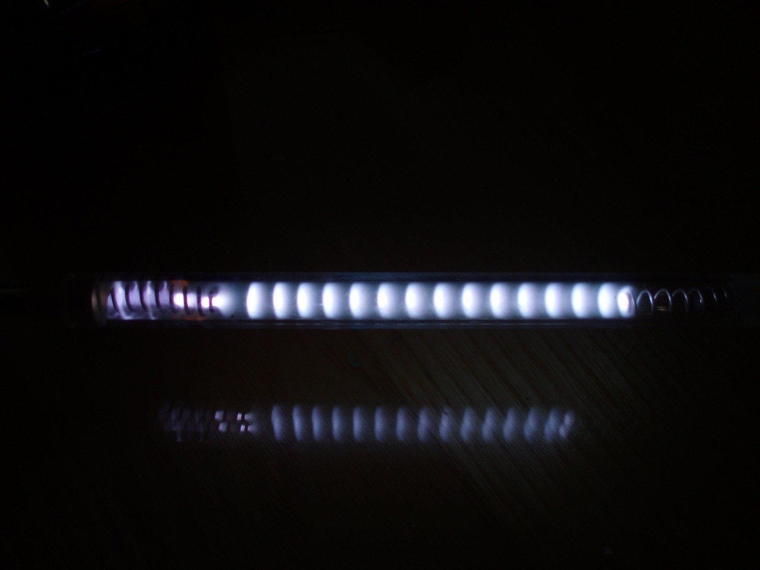 Bei einem Test mit einer Entladungsröhre, die von einer auf Hochspannung liegenden Spule umgeben war, kamen folgende drei Bilder zustande. Vor allem das erste ist sehr eigenartig, da es zwei von einander getrennte Zonen mit Laufzeiterscheinungen zeigt, wobei eine direkt um eine Elektrode herumläuft und nicht wie üblich von der Spitze ausgeht. Das letzte Bild zeigt die Röhre, nachdem so ziemlich alle Fremdstoffe ausgegast sind. |