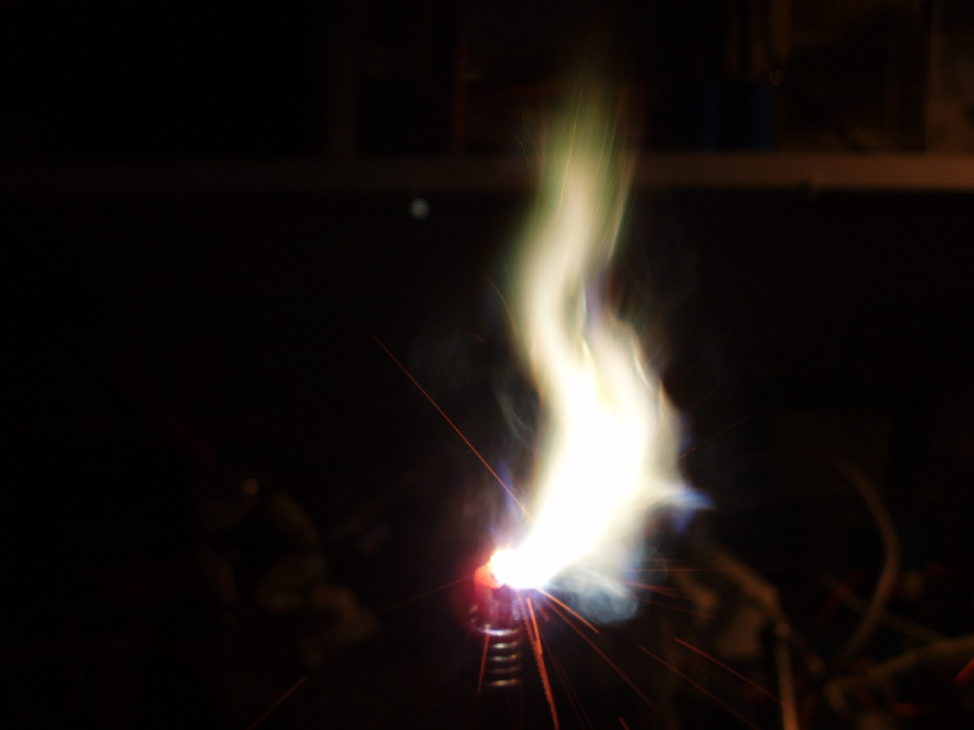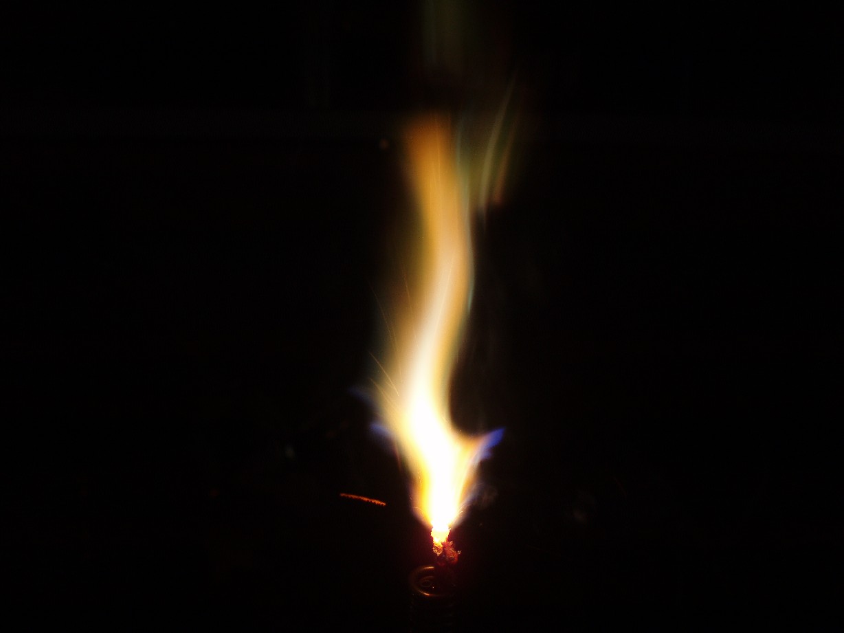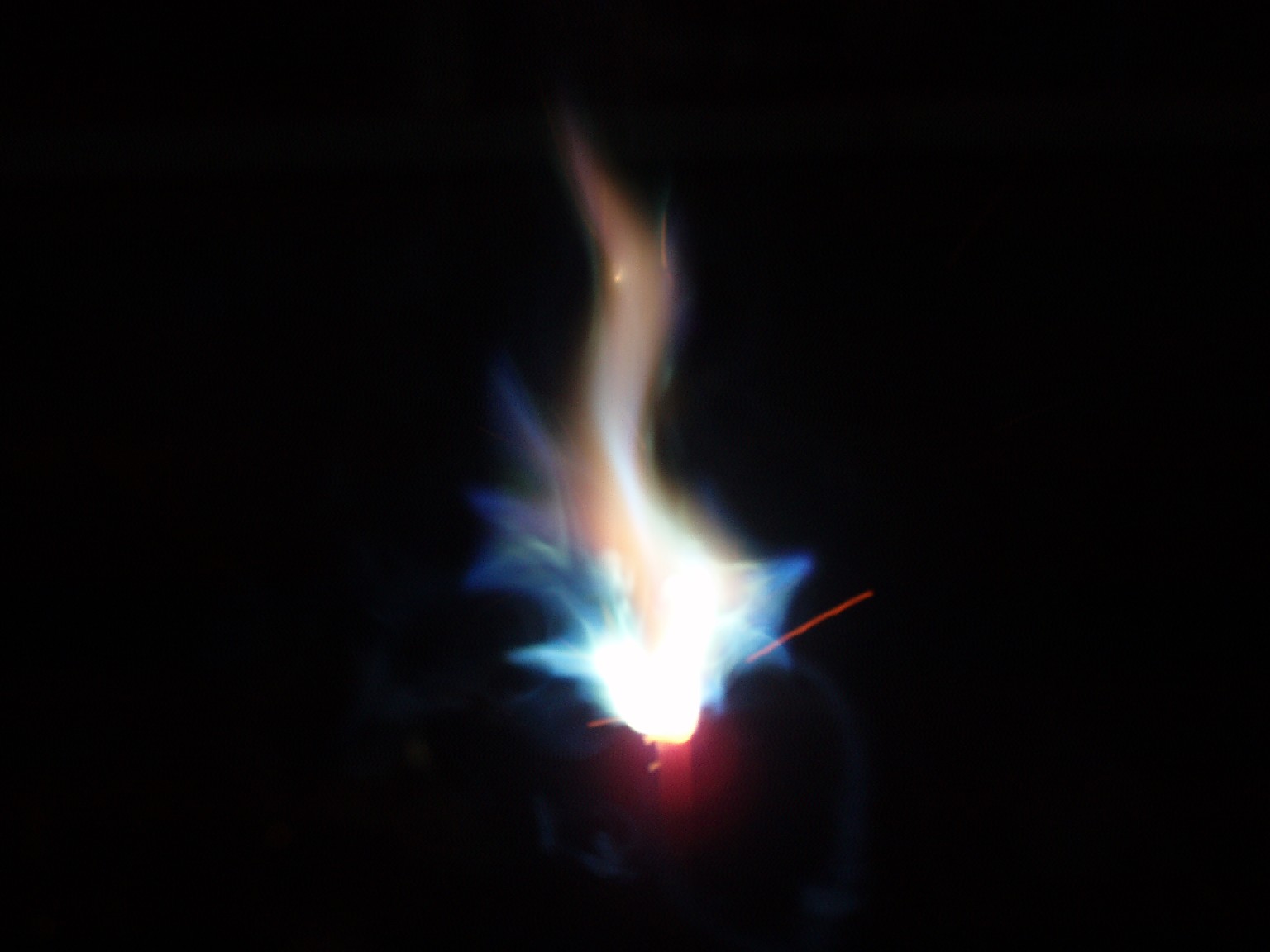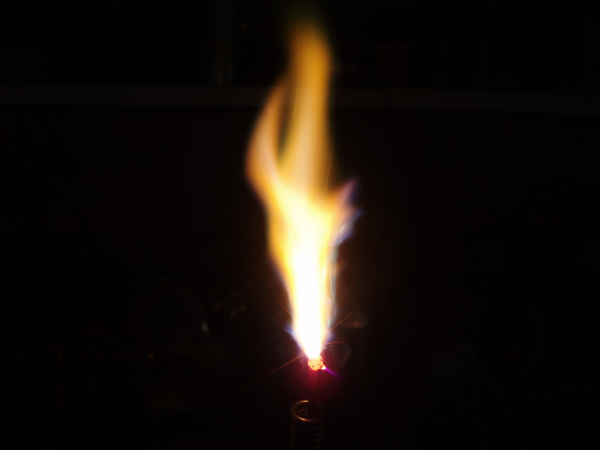 Bei folgenden vier Aufnahmen kam eine Spule mit einer geringeren Resonanzfrequenz (deswegen sind die Bilder nicht so "verrauscht") zum Einsatz. Dabei kann die Flammgröße auch locker mal 10 cm betragen und mit der selben Elektrode wie oben würde auch die Flamme wie die auf dem obigen Foto aussehen (so lang die Elektrode kalt ist) aber verwendet man nun eine spitze Elektrode so bilden sich verschiedenste Formen aus. Die Flamme verhält sich meistens wie eine Kerzenflamme und flackert wild umher doch manchmal wird sie sehr ruhig und vollführt alle Bewegungen wie in Zeitlupe oder erstarrt vollends in einer bestimmten Position. Auf Grund der Hitze verbrennen solche Elektroden jedoch sehr schnell und das verdampfte Metall färbt die Flamme (die blaue Farbe rührt von Kupfer bei Messingelektroden). |