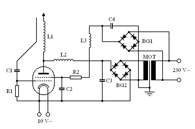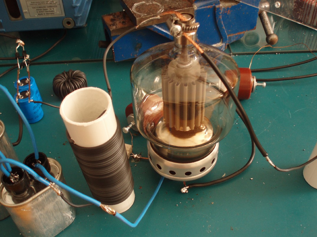 Der Aufbau ist wie gesagt sehr provisorisch gehalten. 2 von 6 eingeplanten MOCs (microwave oven capacitor) haben sich als unbrauchbar erwiesen aber so kritisch ist die ganze Sache nicht und auch das deswegen verstärkt auftretende 50 Hz-Brummen find ich persönlich ganz ok. Zur Schaltung (siehe auch HF-VTTC 1) bleibt nicht viel zu sagen außer, dass der Widerstand (22 W) an Gitter 2 sehr schnell extrem heiß wird. Da aber sowieso noch Änderungen bei der Umrüstung auf die andere Röhre vorgenommen werden ist dieses Problem vorerst vernachlässigbar. |