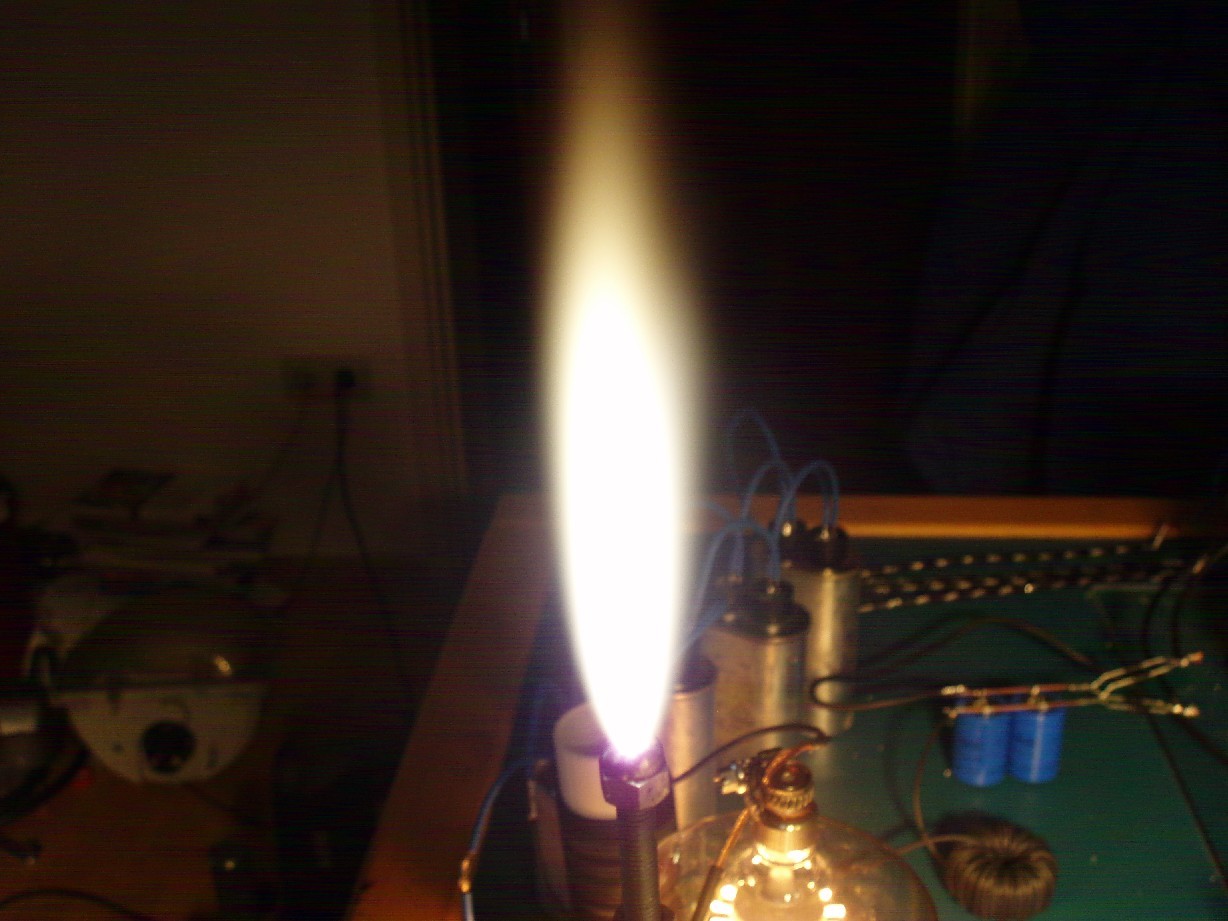 Es stellte sich nach und nach heraus, dass einige Probleme behoben oder zumindest verringert werden können indem man einfach die Resonanzfrequenz der Spule herabsetzt. Dabei änderte sich nicht die Flammgröße oder deren Intensität aber der Skineffekt, der dazu führte, dass die Spule heiß wird (manchmal auch zu heiß) konnte drastisch verringert werden ohne eine Leitung mit größerem Querschnitt verwenden zu müssen und auch für die Gesundheit des Experimentators dürften geringere Frequenzen besser sein. |
