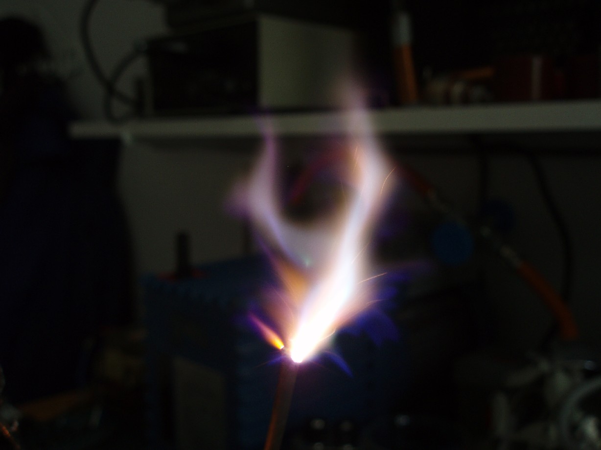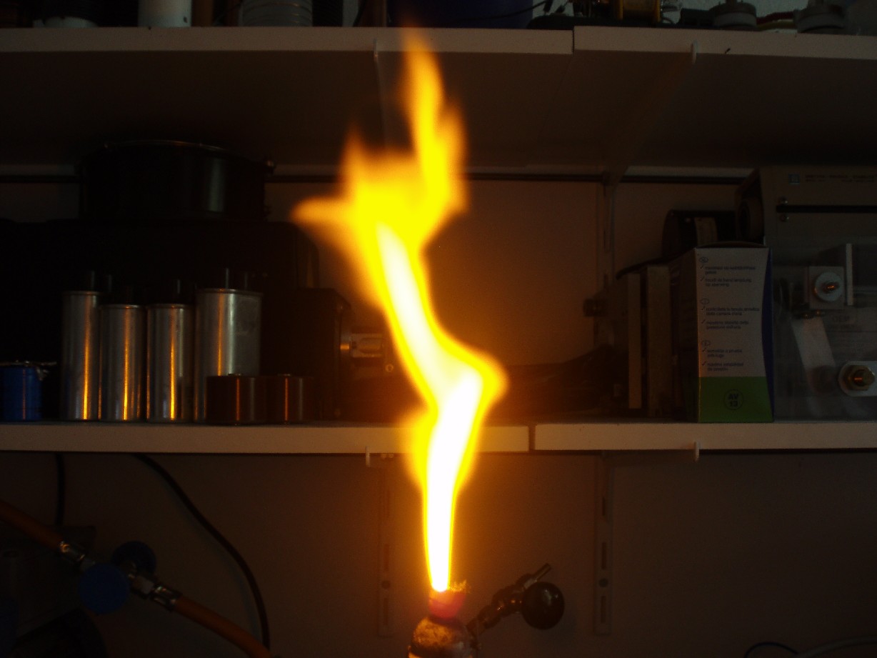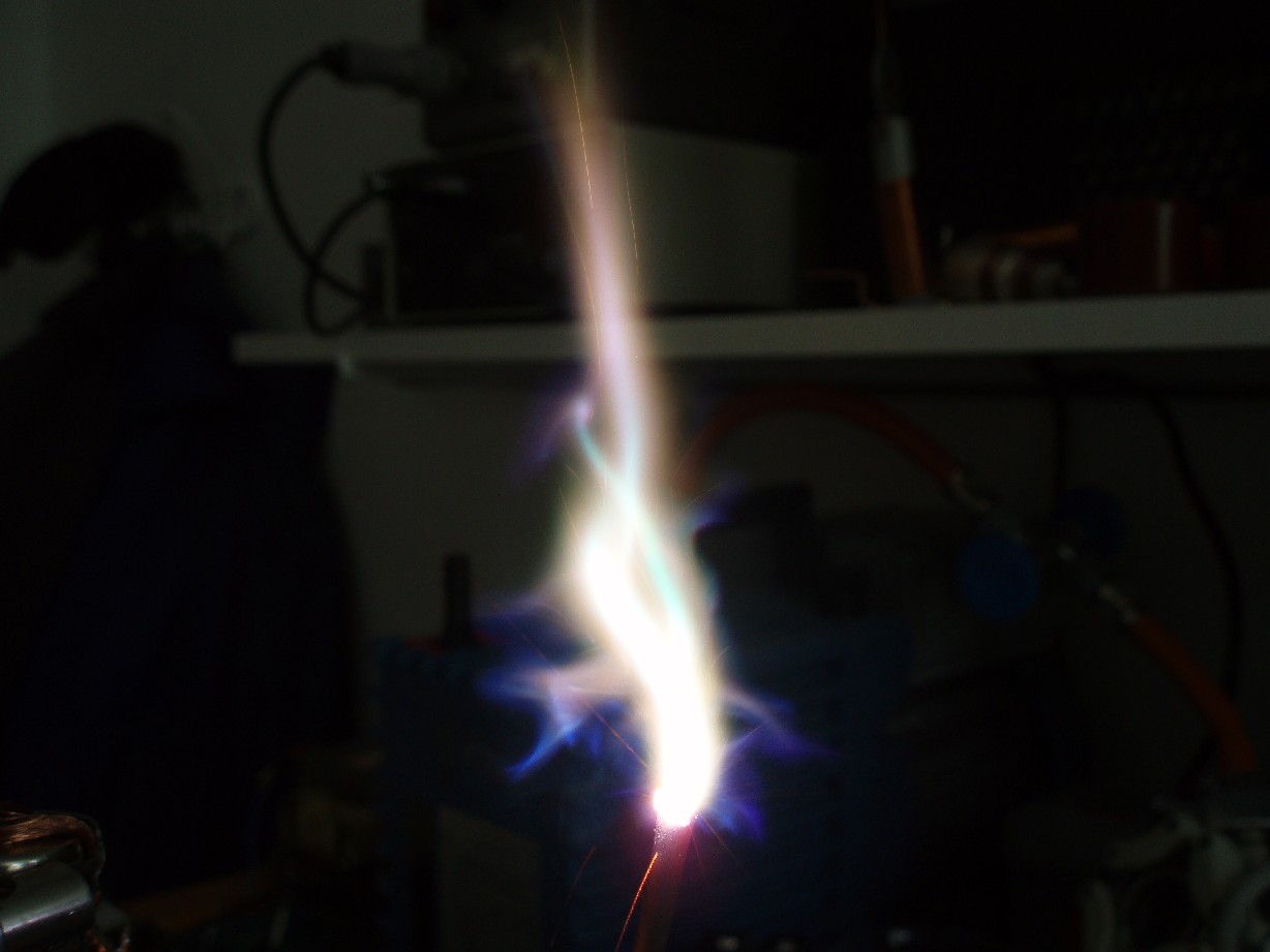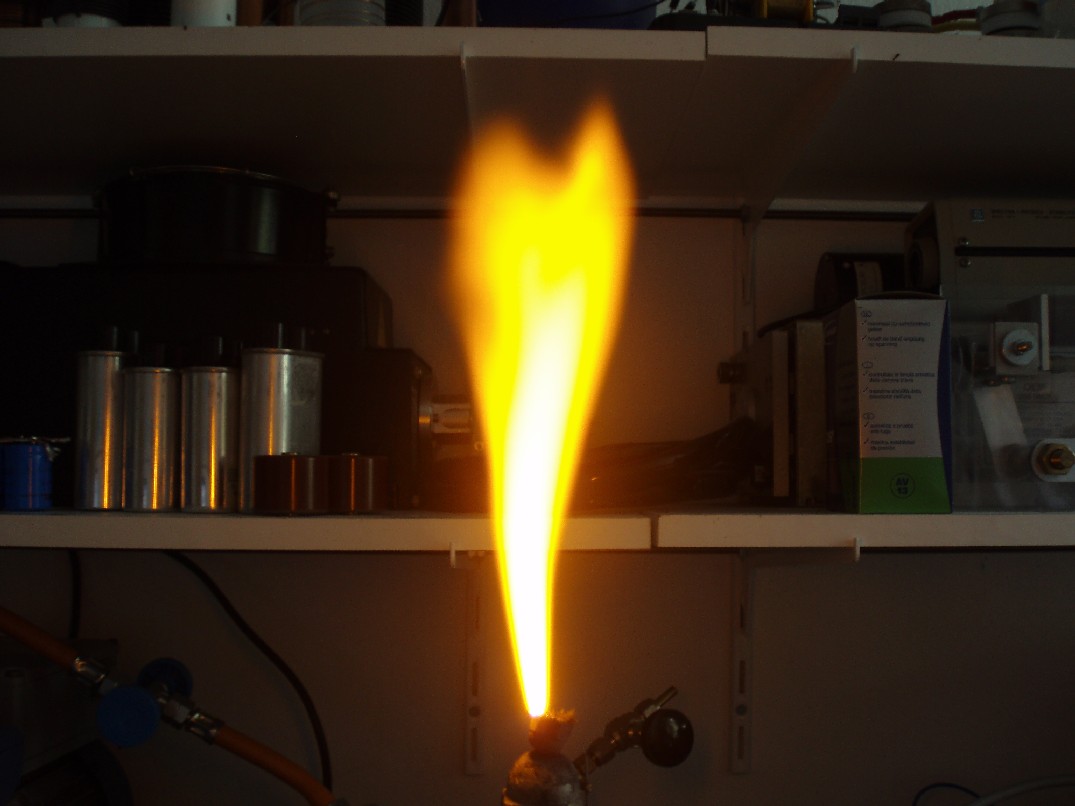 Nach der Überarbeitung sah der Output dann wie auf folgenden Fotos aus. Nicht nur ist die Flamme viel heißer als zuvor sondern auch die Höhe ist gewaltig gestiegen. Auf dem ersten Foto beträgt die Flammenhöhe etwa 12 cm. Die Flamme flackert sehr stark und so sieht man mit dem blosem Auge eine sich nach oben hin aufweitende helle Flamme. |