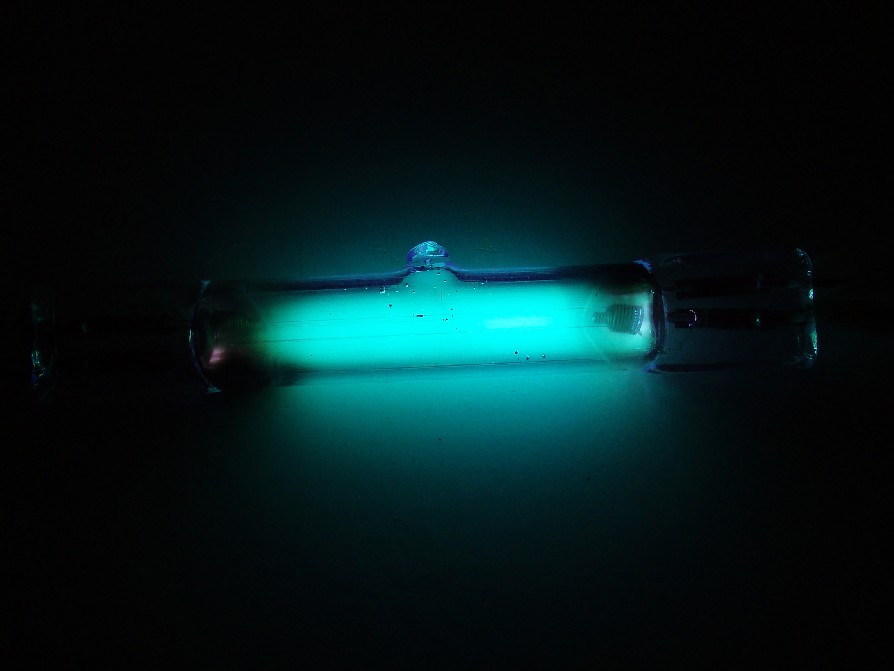 Die Farbe ist in der Regel türkis. Bei genauer Betrachtung erkennt man die Quecksilbertröpfchen in der Glasröhre.