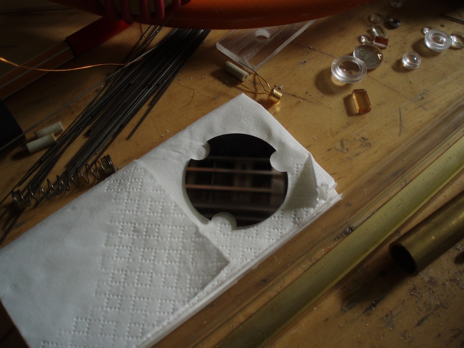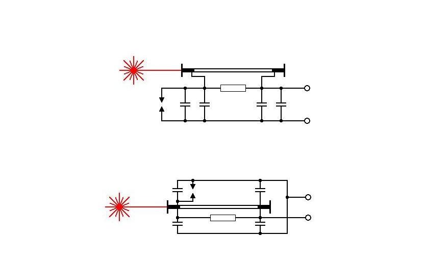 Das Grundgerüst sollte ein großes Alu-U-Profil bilden. Da kein passendes U-Profil aufzutreiben war, wurde es durch zwei Alu-Winkel-Profile und eine dünne Alu-Grundplatte ersetzt. Zur Stabilität und Isolation befindet sich oben und unten noch je eine Platte aus Acrylglas. Die End-Elektroden sind aus verschiedenen Messingrohren und Platten zusammengesetzt, wobei die einzelnen Teile für eine bessere Stabilität vor dem Verlöten in einander geschoben wurden. Die Entladungsröhre aus Borosilikat-Glas ist 40 cm lang, hat einen Innendurchmesser von etwa 8 mm und eine Wandstärke von etwa 1 mm. Sie passt genau in die Elektroden-Röhren und wird mit Silikonmasse und Schrumpfschlauch gegen diese abgedichtet. Die Funkenstrecke bereitete die meisten Probleme, da sie nicht den Rahmen sprengen sollte, den die beiden Alu-Profile vorgaben. Die Pulsschaltung entspricht diesem Schaltplan. Die untere Schaltung zeigt wie sie im Laserkopf aufgebaut ist. |