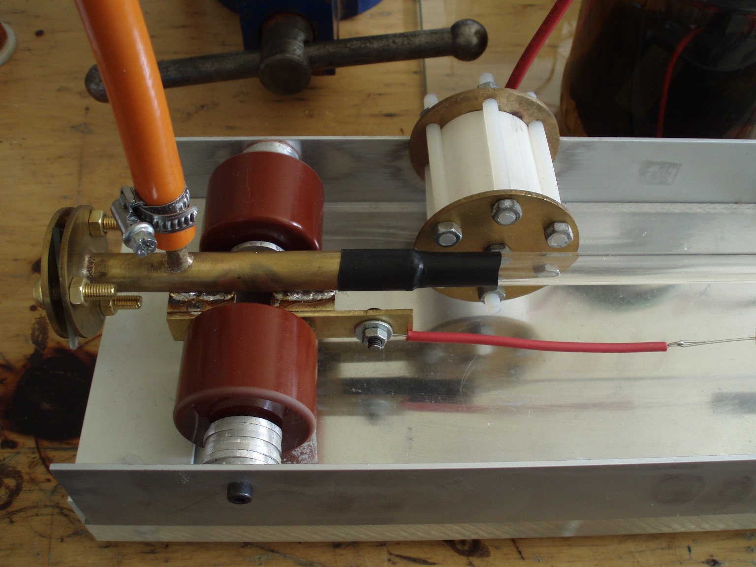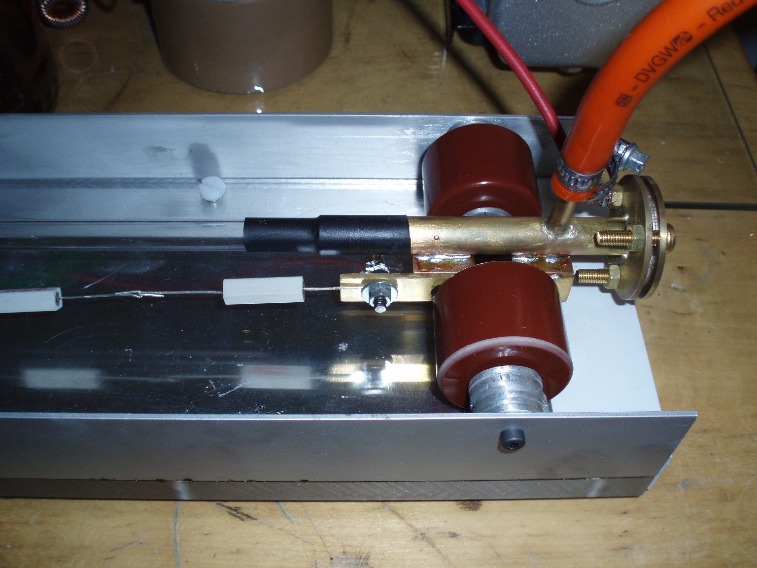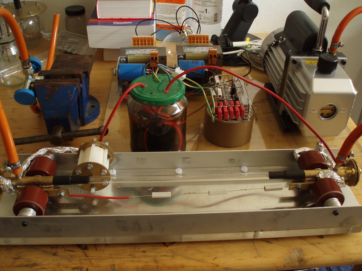 Die Spannung von geschätzten 15-40 kV, die für dieses Projekt benötigt wurde, war mit dem 8KV-Neon-Trafo nicht zu erreichen und so musste für das Projekt eine eigene Hochspannungsquelle her. Aus diesem Grund wurde die ZVS-Ansteuerung gebaut, wie sie im Hochspannungsteil dieser Webseite näher behandelt wird. Da der Laser bei Unterdruck arbeitet und nicht absolut vakuumdicht aufgebaut ist, wird eine Vakuumpumpe zur Erhaltung des benötigten Unterdrucks verwendet. Auf der Gegenseite ist ein Gas-Einlassventil angeschlossen, das zur Regulierung des Drucks aber nur bedingt geeignet ist. Die ursprünglich vorgesehene Ladedrossel erfüllte ihre Aufgabe überhaupt nicht und wurde dann durch drei 10 kOhm Widerstände ersetzt. |
