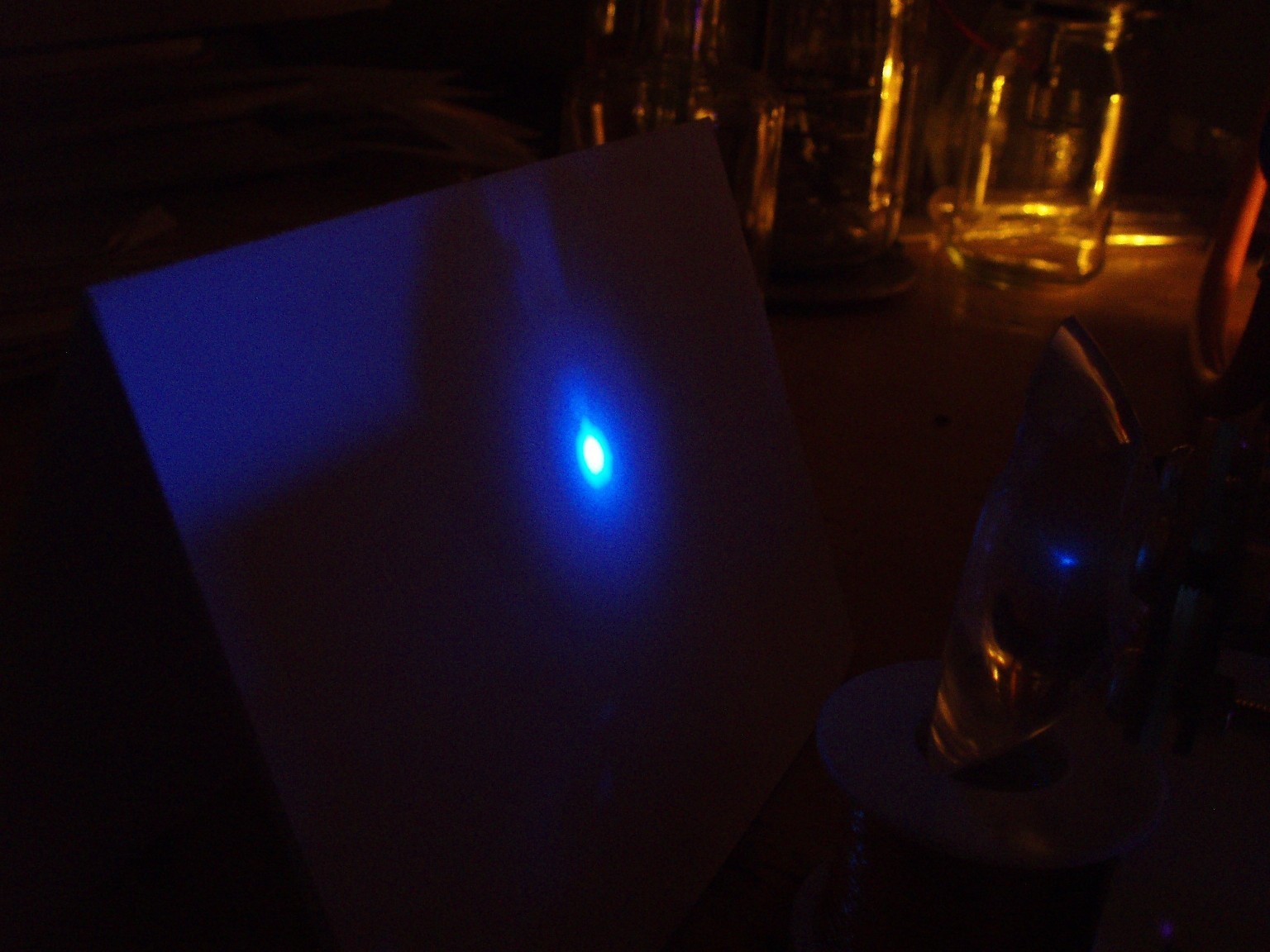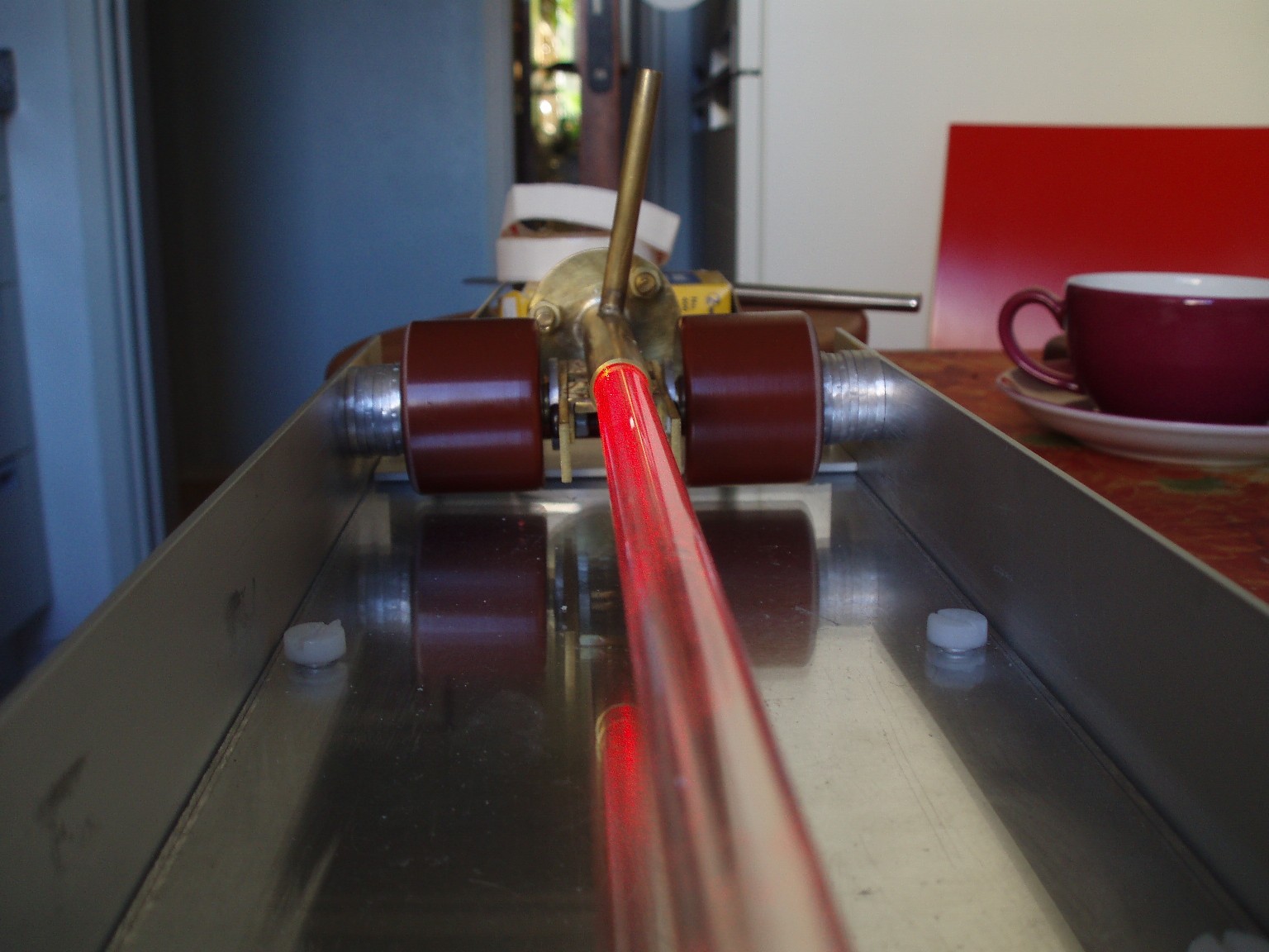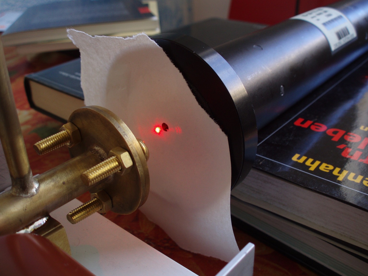 Noch vor dem ersten funktionierenden TEA-Laser habe ich diesen longitudinal angeregte Stickstoff-Laser konstruiert. An sich ist das Projekt noch relativ einfach aufgebaut, aber die Umsetzung stellte sich dann doch als problematischer heraus als gedacht. Das vorrangige Ziel war, den Laser zum Laufen zu bringen, ohne die Ausgangsleistung und die Strahlqualität zu beachten. Der Laserkopf ist etwa 50 cm lang und wird im Superstrahlmodus bei einem Druck von wenigen Millibar (Durchflussbetrieb) betrieben. |