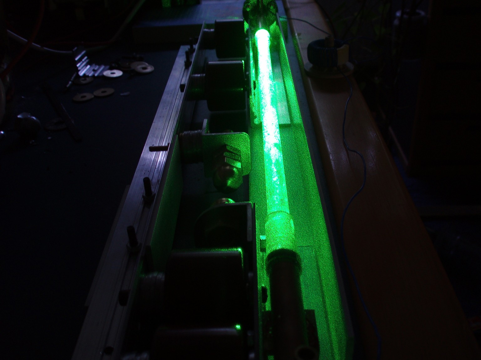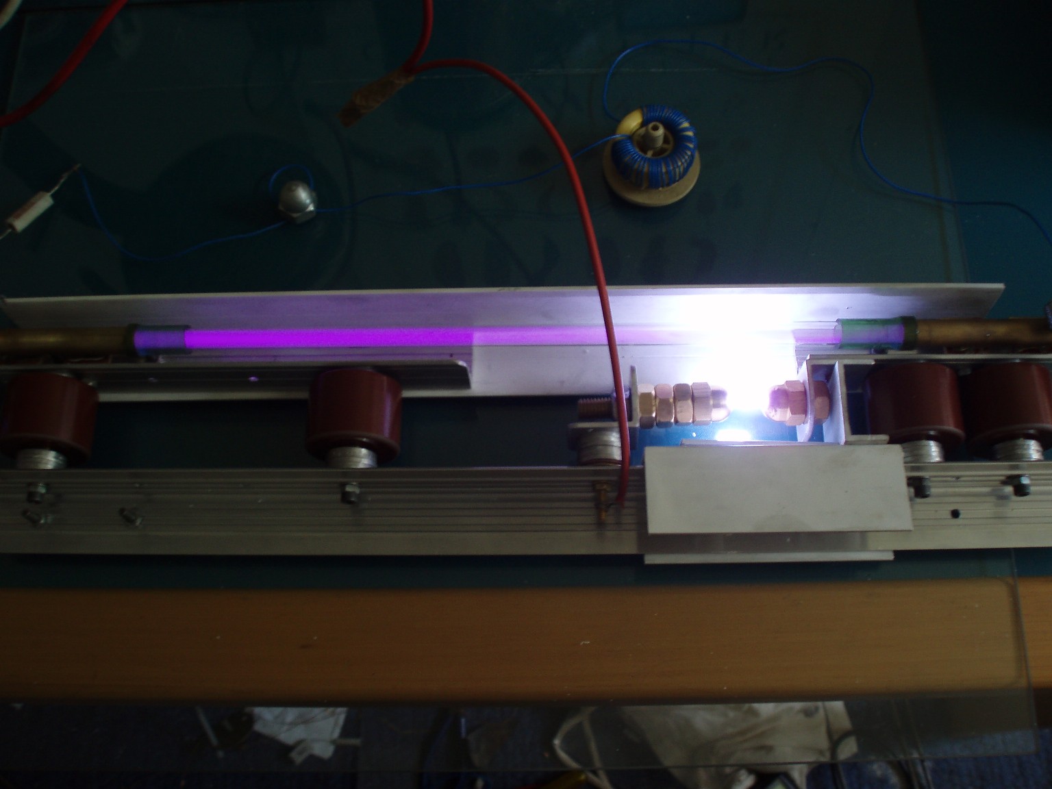 mit einer Entladungsröhre mit 40 cm Länge und ca. 8 mm Innendurchmesser betrieben. Bei den