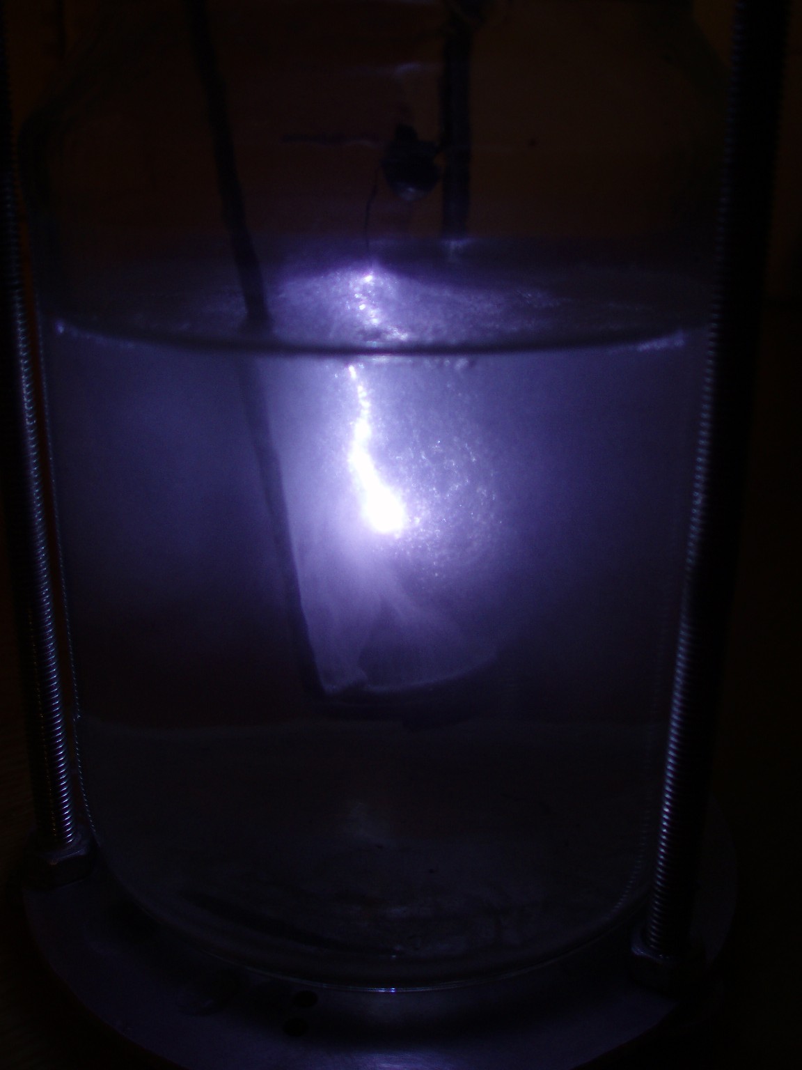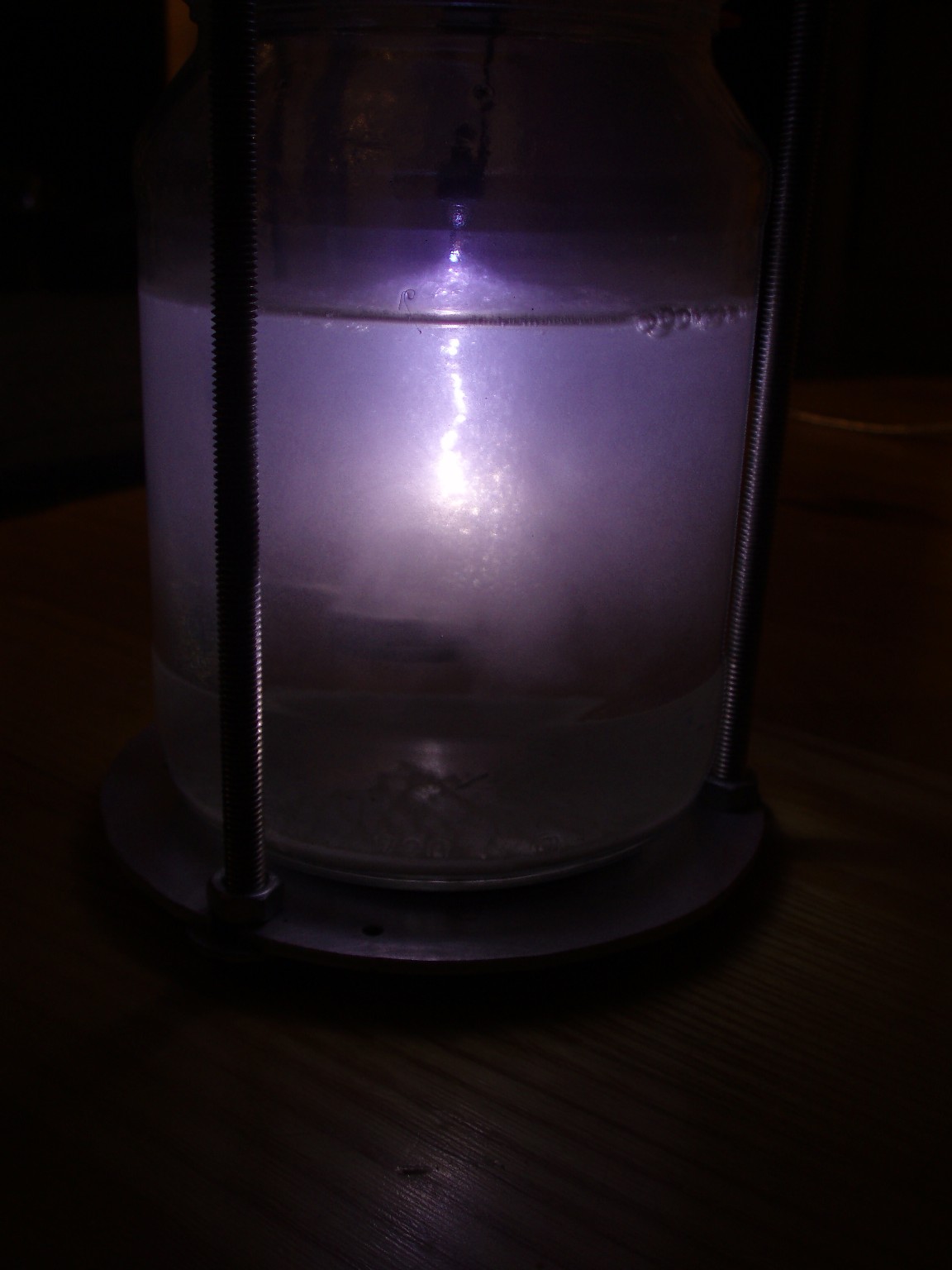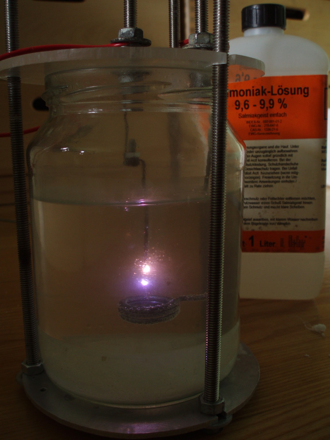 Kochsalz ist als Elektrolyt eher ungeeignet, da es die Elektroden stark angreift und sich ein erst grüner dann brauner Schlamm bildet, der die Entladungserscheinung verdeckt. Ammoniaklösung eignet sich deutlich besser. Ein Grund dafür ist, dass somit kein Natrium mit im Spiel ist, das die Leuchterscheinung schon in geringen Mengen gelb färben würde. Da nicht mehr genug Ammoniaklösung vorhanden war, wurde ein ammoniakalisch riechendes Salz (vermutlich Ammoniumkarboant) beigemischt. Auch wurde ein neues Gerät konstruiert, das über eine isolierende Acrylglasplatte als Deckel verfügt. Dies erleichtert die Anbringung der Elektroden und ist etwas sicherer zu handhaben. |