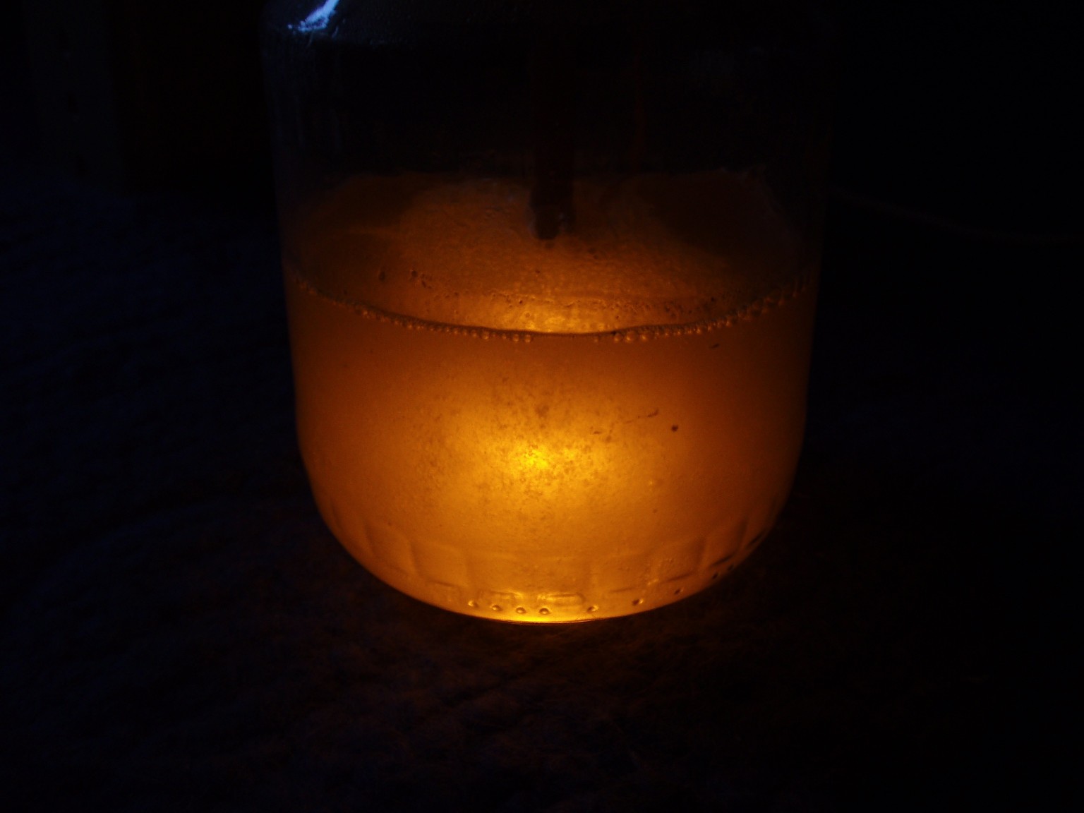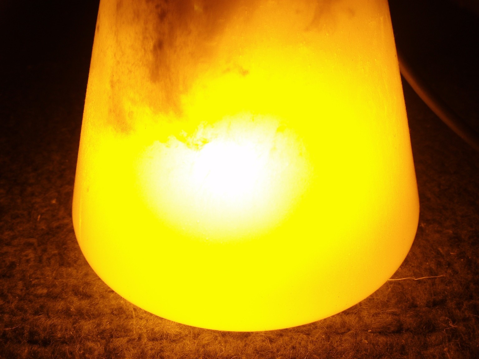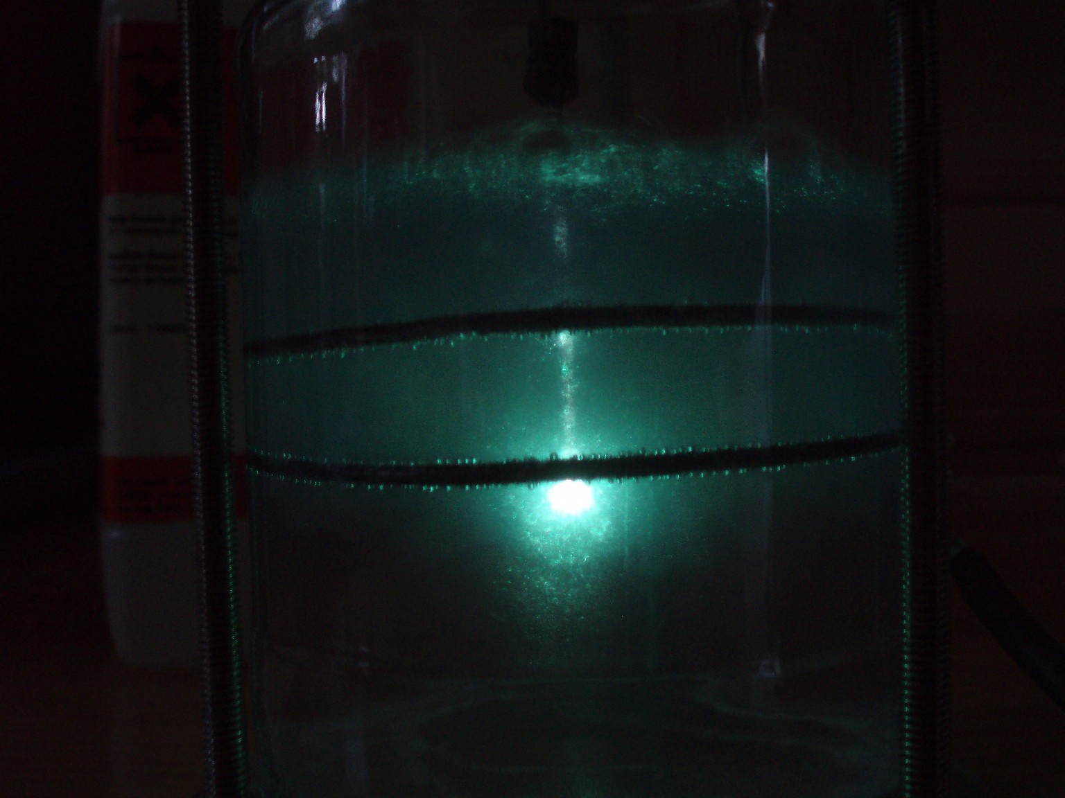 Kochsalz ist als Elektrolyt eher ungeeignet, da es die Elektroden stark angreift und sich ein erst grüner dann brauner Schlamm bildet, der die Entladungserscheinung verdeckt. Ammoniaklösung eignet sich deutlich besser. Ein Grund dafür ist, dass somit kein Natrium mit im Spiel ist, das die Leuchterscheinung schon in geringen Mengen gelb färben würde. Da nicht mehr genug Ammoniaklösung vorhanden war, wurde ein ammoniakalisch riechendes Salz (vermutlich Ammoniumkarboant) beigemischt. Auch wurde ein neues Gerät konstruiert, das über eine isolierende Acrylglasplatte als Deckel verfügt. Dies erleichtert die Anbringung der Elektroden und ist etwas sicherer zu handhaben. |