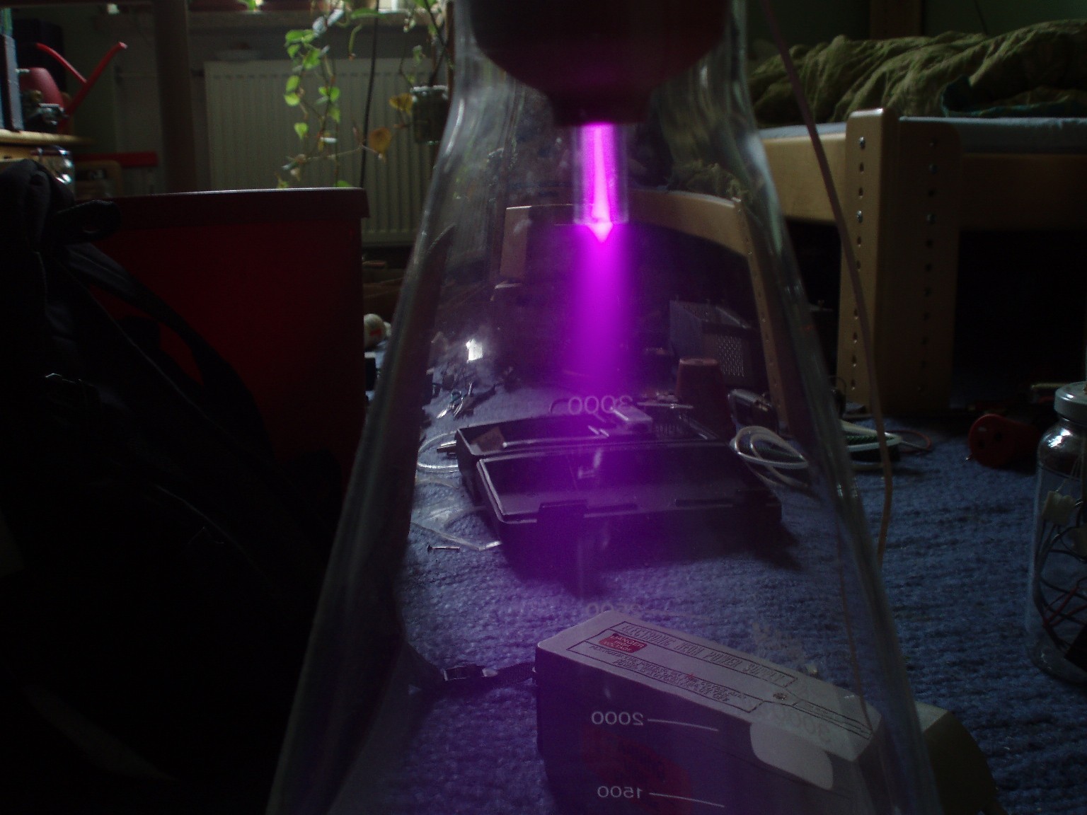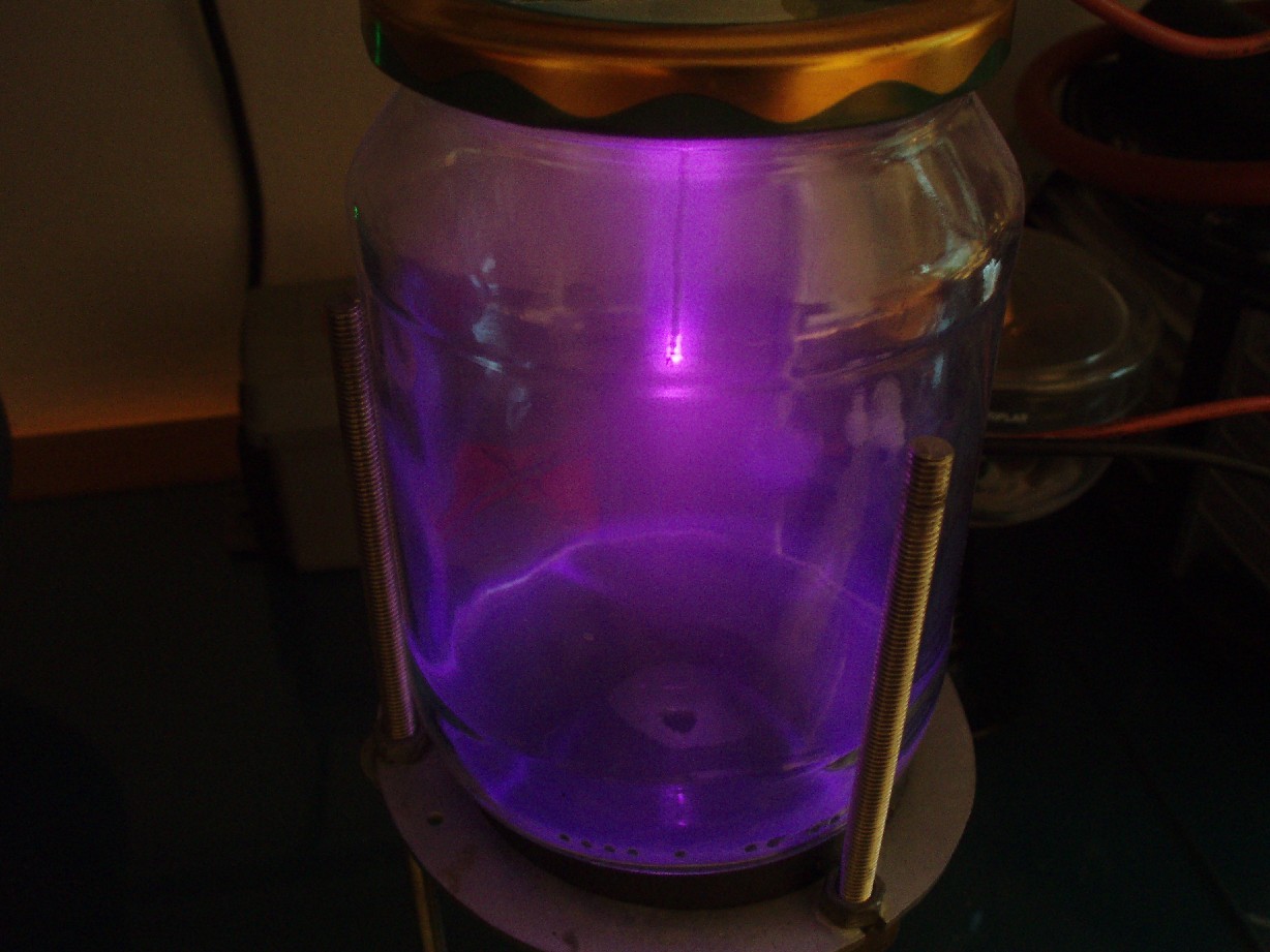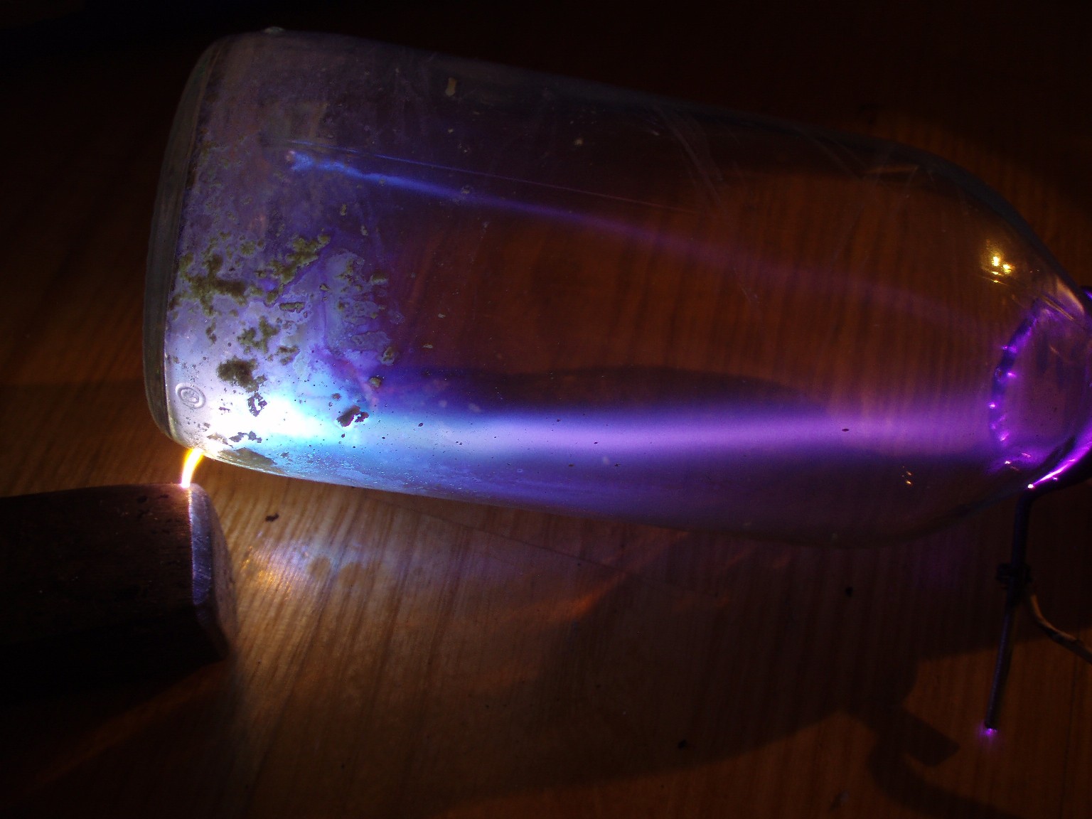 | | Diese Flasche ist mit ein wenig Schwefel gefüllt, um die schöne blaue Farbe von angeregtem Schwefeldampf zu beobachten. Die Stromanschlüsse befinden sich außerhalb des Glases, soll heißen, dass der Stromfluss durch den Kontakt der Elektroden mit dem Glas von außen stattfindet. Der Test wurde abgebrochen, weil die Bogenentladung, die auf dem Bild zu sehen ist, ein Loch durch die Flasche gebrannt hat. |