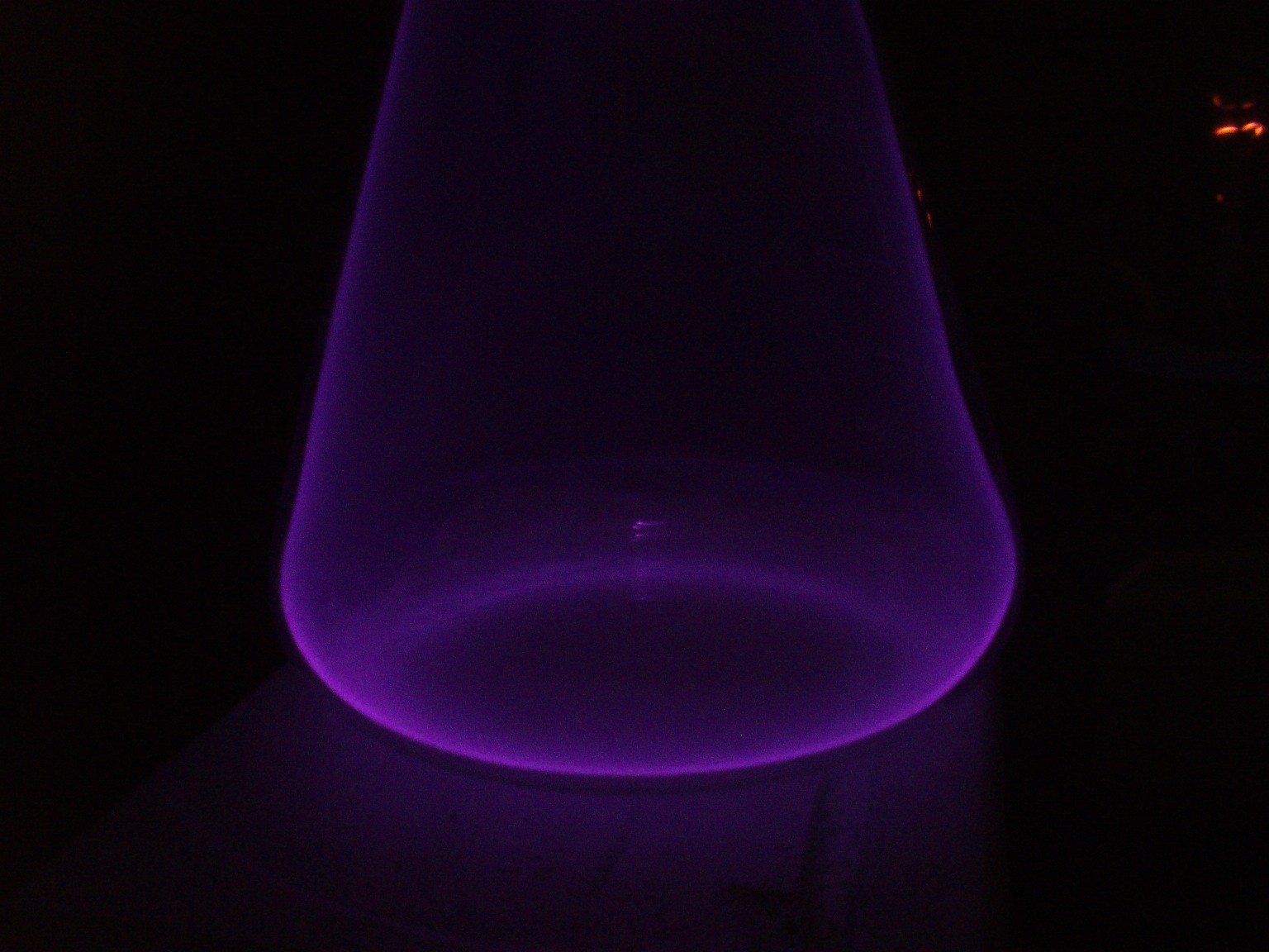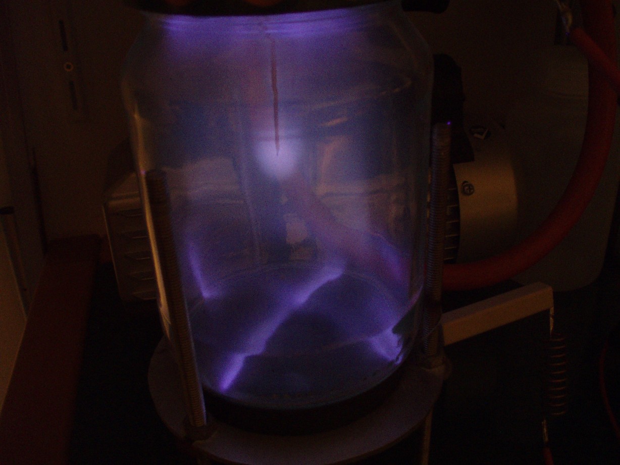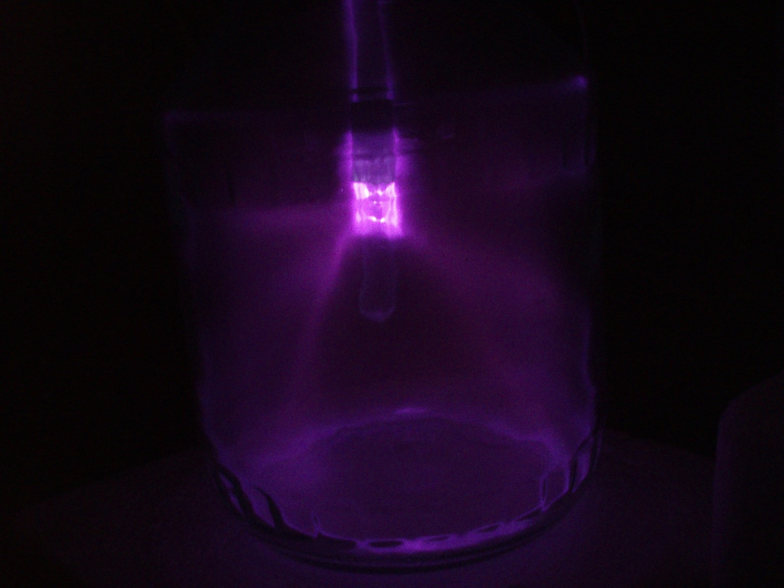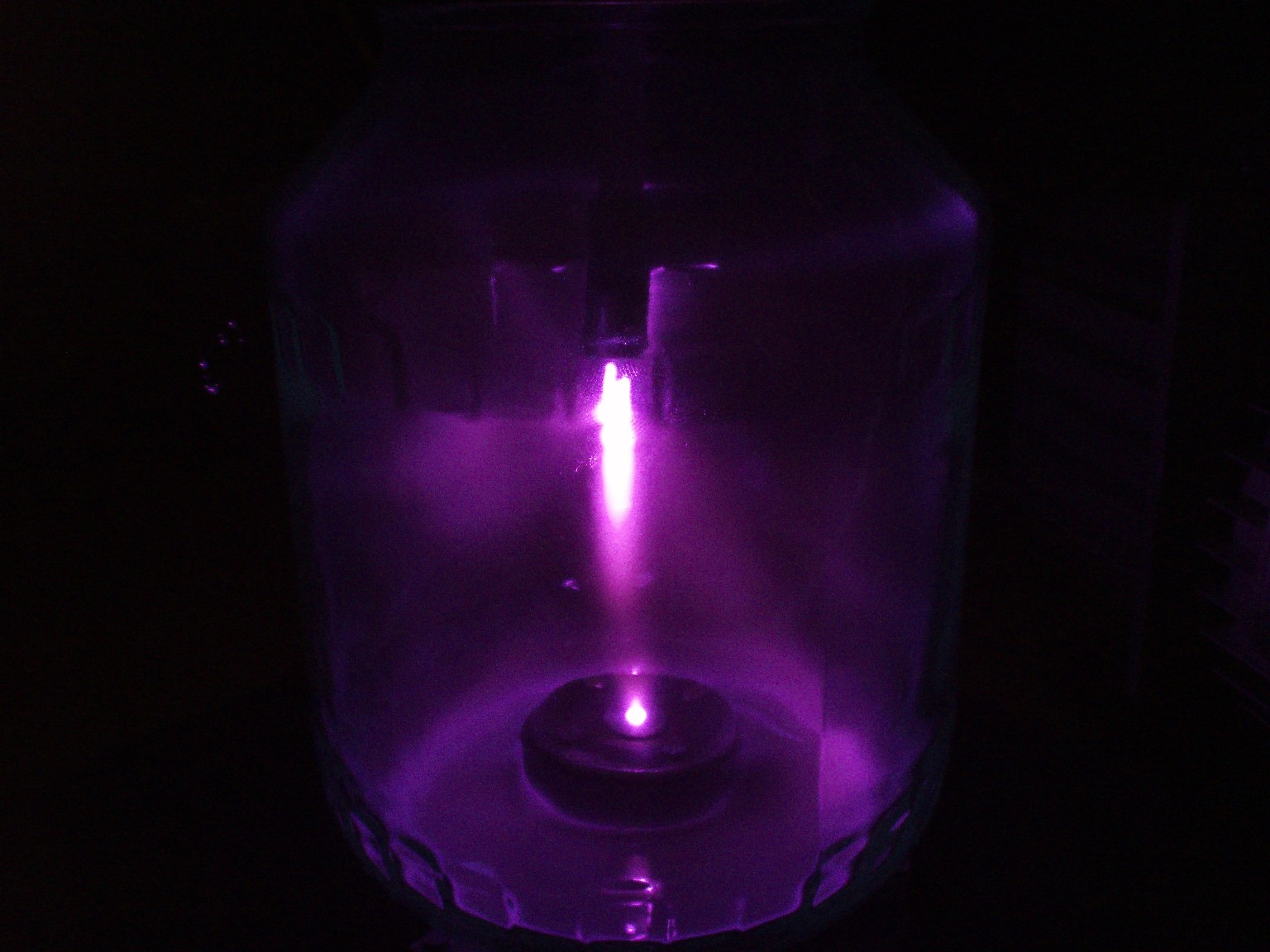 | | Diese Flasche ist mit ein wenig Schwefel gefüllt, um die schöne blaue Farbe von angeregtem Schwefeldampf zu beobachten. Die Stromanschlüsse befinden sich außerhalb des Glases, soll heißen, dass der Stromfluss durch den Kontakt der Elektroden mit dem Glas von außen stattfindet. Der Test wurde abgebrochen, weil die Bogenentladung, die auf dem Bild zu sehen ist, ein Loch durch die Flasche gebrannt hat. |